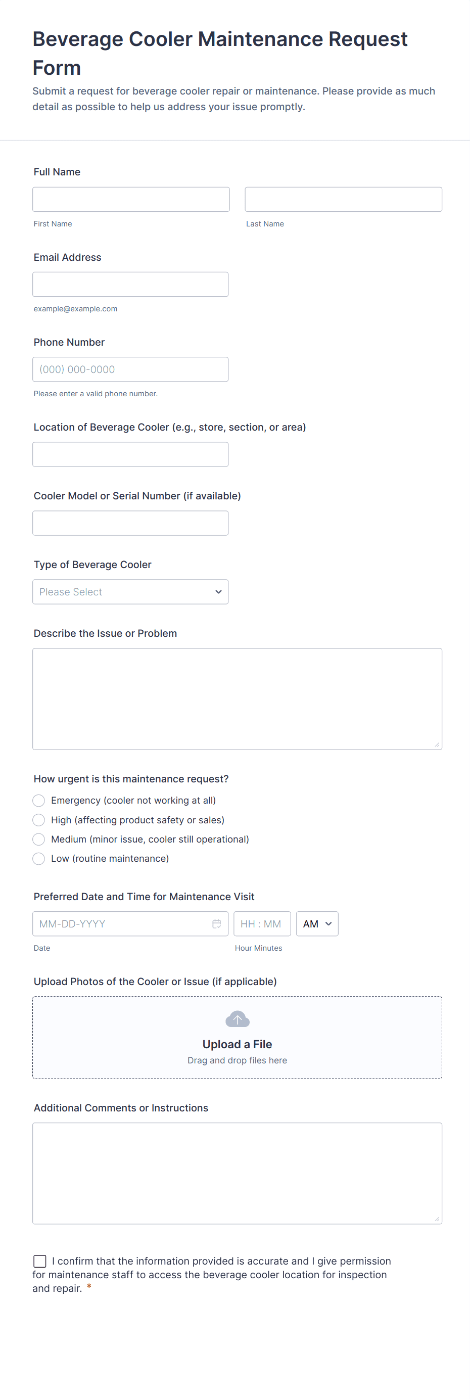 Equipment maintenance forms are structured documents used to report, schedule, and document maintenance activities for equipment and assets. They help teams track maintenance needs, record service actions, and maintain a clear history of repairs, inspections, and preventive maintenance. Equipment maintenance forms are commonly used in manufacturing, facilities, healthcare, laboratories, construction, and IT environments to reduce downtime and extend equipment lifespan. Typical workflows include maintenance requests, inspection logs, preventive maintenance checklists, repair reports, and service completion confirmations. By standardizing maintenance documentation, these forms improve response time, support compliance, and make maintenance planning more reliable.