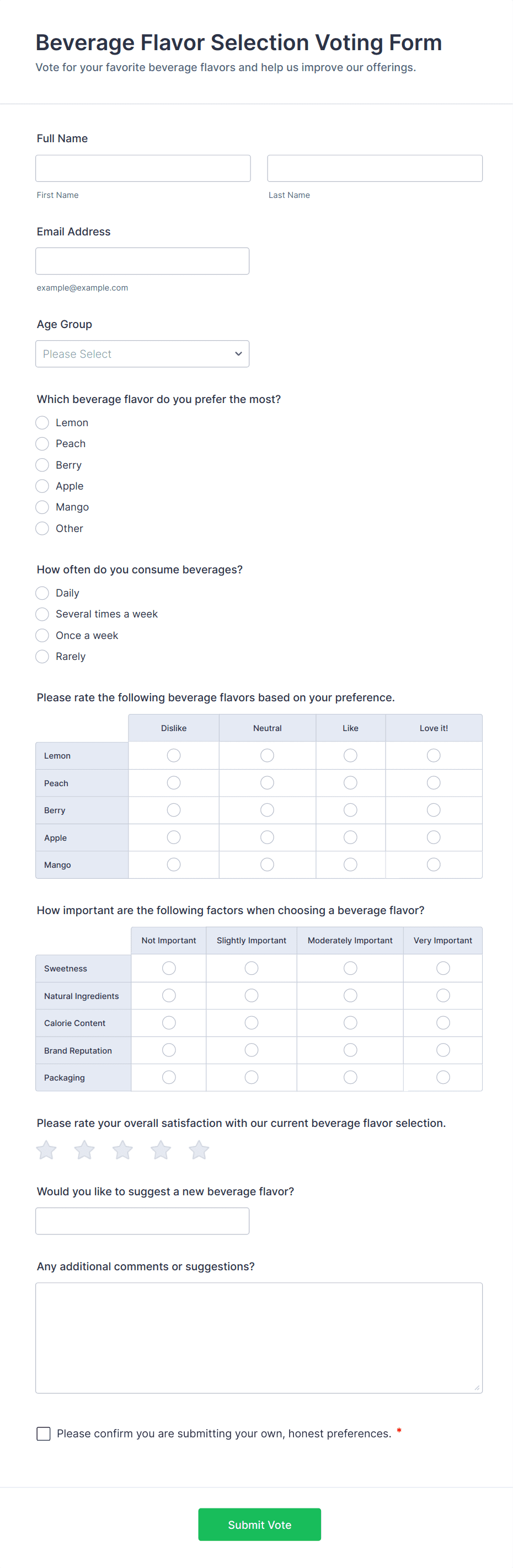 Voting forms are digital tools designed to collect, organize, and analyze votes or preferences from a group of participants. They are commonly used for elections, polls, surveys, award nominations, event planning, and decision-making processes in organizations, schools, clubs, and communities. Voting forms streamline the process of gathering input, whether it’s for selecting a new team leader, choosing a favorite project, or making group decisions efficiently. Their versatility makes them suitable for both formal elections and informal opinion polls, ensuring that every participant’s voice is heard and recorded accurately.