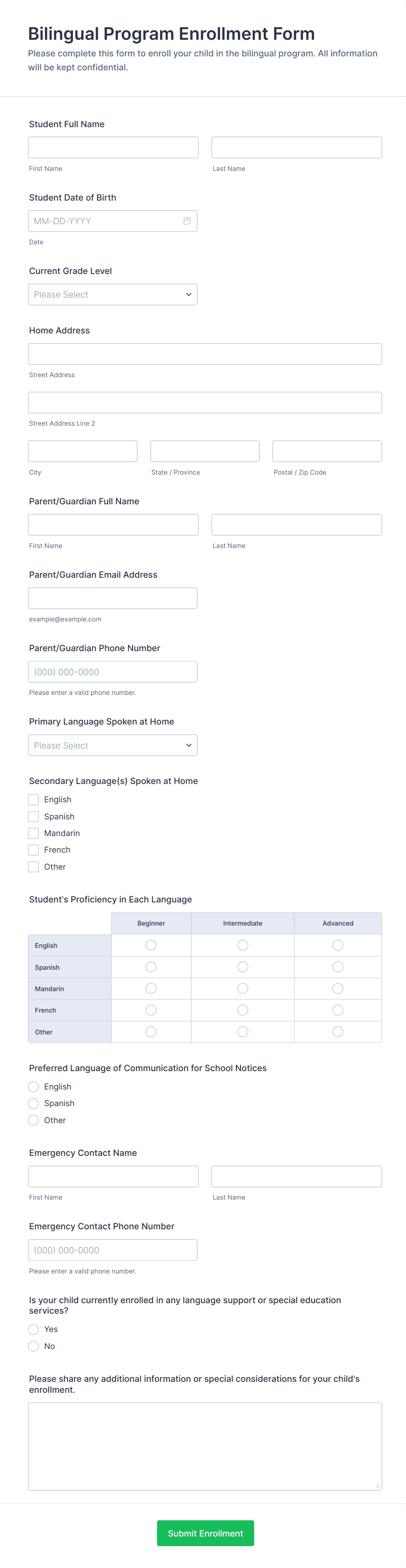 Student Enrollment Forms are essential tools used by educational institutions to collect and organize information from prospective or returning students. These forms streamline the process of registering students for schools, colleges, training programs, extracurricular activities, or special courses. They typically gather key details such as personal information, academic history, emergency contacts, and consent agreements. Whether for K-12 schools, universities, language academies, or summer camps, Student Enrollment Forms help administrators efficiently manage admissions, track student data, and ensure compliance with institutional or governmental requirements.
