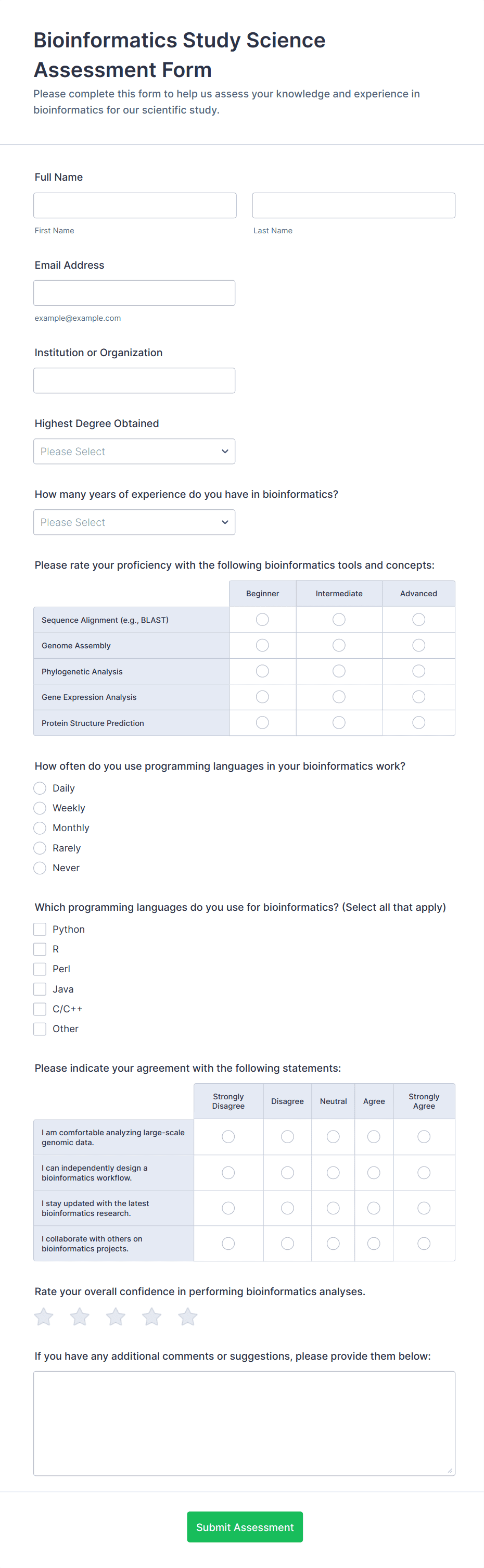 Histology Techniques Assessment Form helps educators and lab managers evaluate histology experience, proficiency, and training needs using an online, customizable Jotform assessment template.