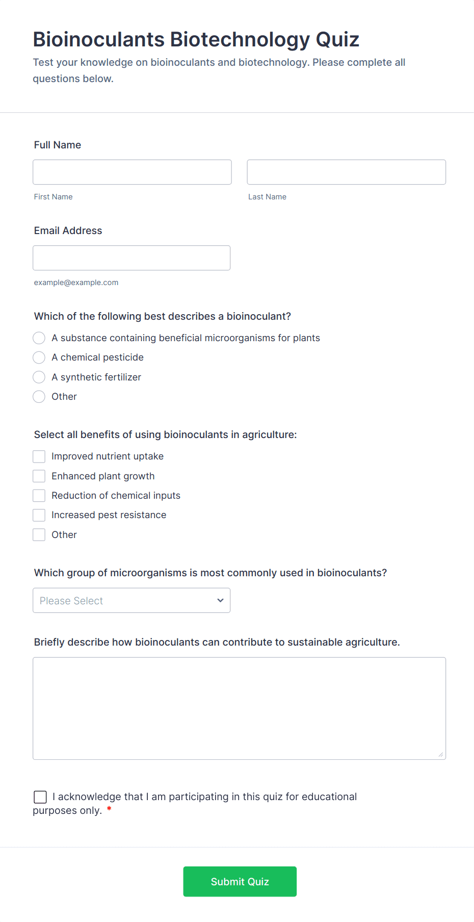 By following these steps, you can create a professional, fully customized quiz template that meets your objectives—whether it’s for classroom assessments, employee training, lead generation, or event engagement. Jotform’s no-code builder, advanced logic, and robust data management tools make the entire process efficient and user-friendly.