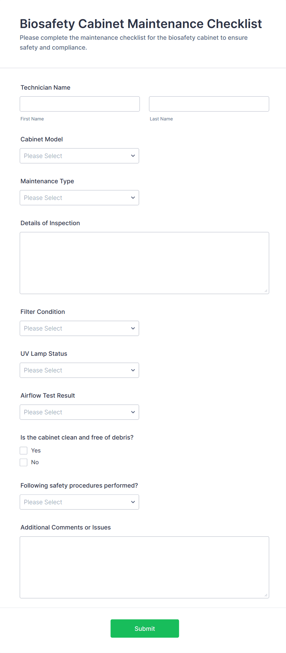 Equipment maintenance forms are structured documents used to report, schedule, and document maintenance activities for equipment and assets. They help teams track maintenance needs, record service actions, and maintain a clear history of repairs, inspections, and preventive maintenance. Equipment maintenance forms are commonly used in manufacturing, facilities, healthcare, laboratories, construction, and IT environments to reduce downtime and extend equipment lifespan. Typical workflows include maintenance requests, inspection logs, preventive maintenance checklists, repair reports, and service completion confirmations. By standardizing maintenance documentation, these forms improve response time, support compliance, and make maintenance planning more reliable.