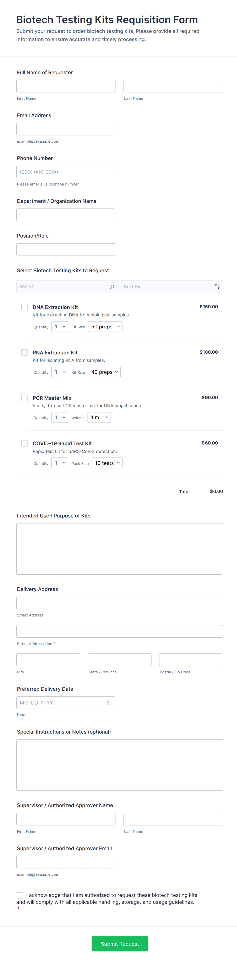 A medical supply order form is a document that allows medical personnel to order medical supplies from a healthcare organization. With a secure Medical Supply Order Form, you can easily order supplies from your hospital, pharmacy, or medical supply store. Just customize the form and use the Jotform Mobile App to start collecting responses — and even update your inventory and pricing as you go!