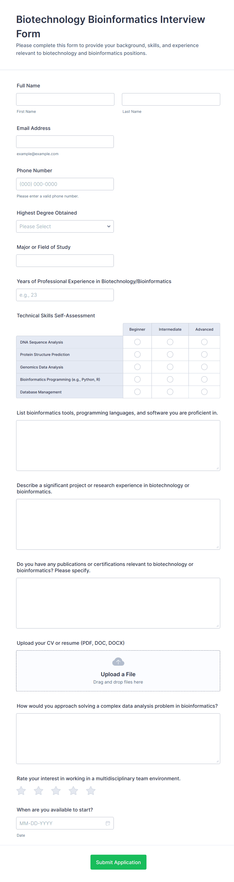 An interview form is a structured document or digital tool used to collect information from individuals during interviews. It standardizes the questions and response formats, ensuring consistency and efficiency in data collection.