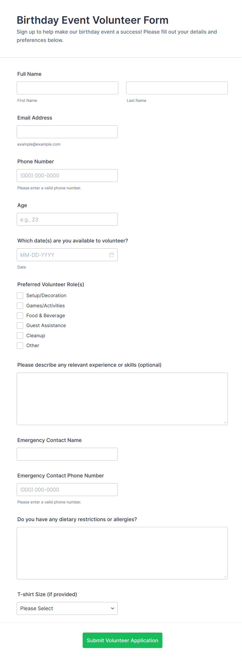 - Event-Specific Forms: May include fields for preferred shifts, t-shirt sizes, and specific roles