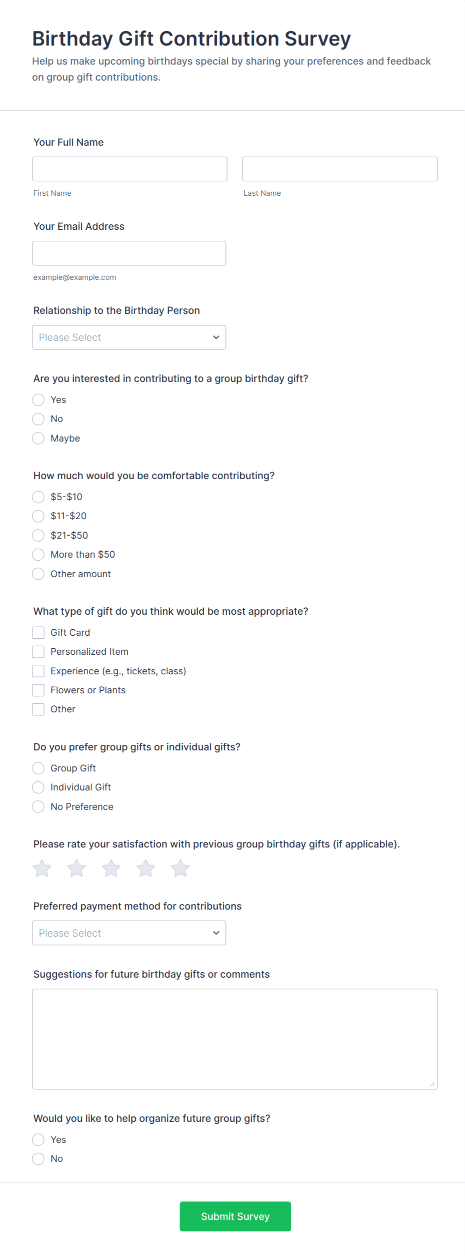 • For customer satisfaction surveys, include Net Promoter Score (NPS) fields or star ratings.