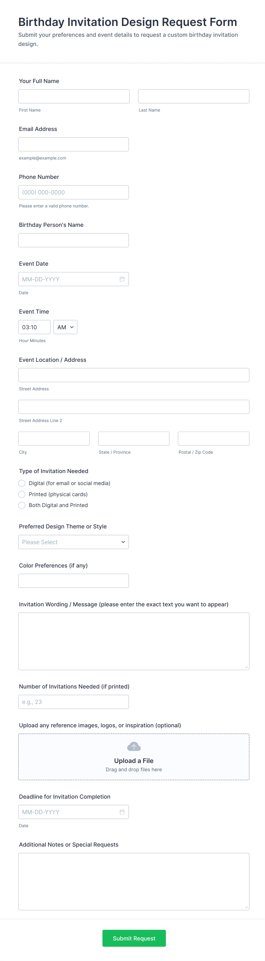 Event request forms are structured documents used to submit, review, and manage requests to plan or host an event. They help organizers collect consistent details like event purpose, dates, location needs, audience size, budget, and required services so events can be approved and coordinated efficiently. Event request forms are commonly used by companies, schools, nonprofits, venues, and community organizations for internal events, workshops, trainings, celebrations, marketing events, and public programs. By standardizing event requests, these forms reduce back-and-forth, improve planning accuracy, and create a clear record of event requirements from the start.