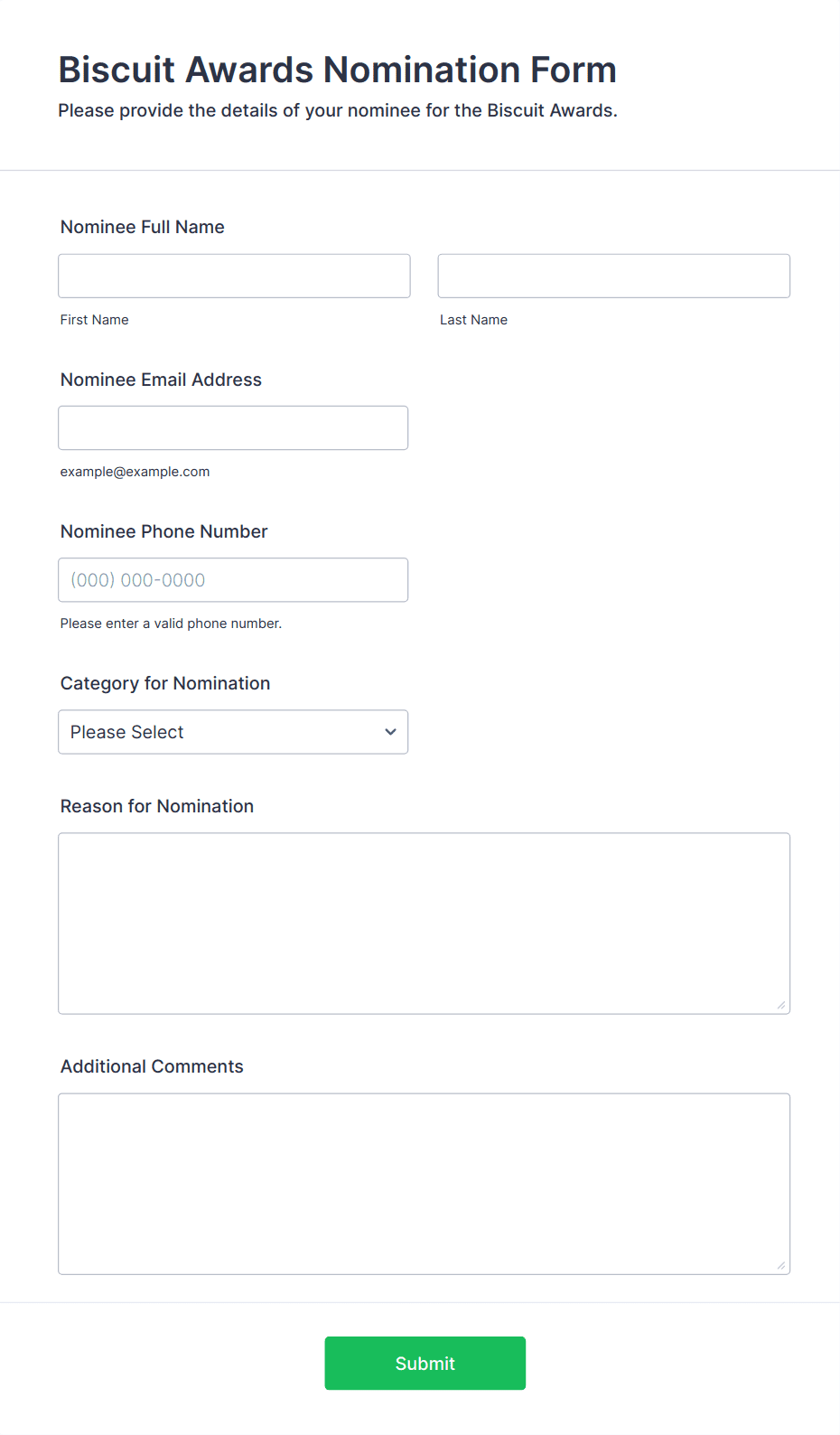 Award forms are used by HR departments, schools, non-profits, event organizers, professional associations, and anyone running a recognition or competition program.