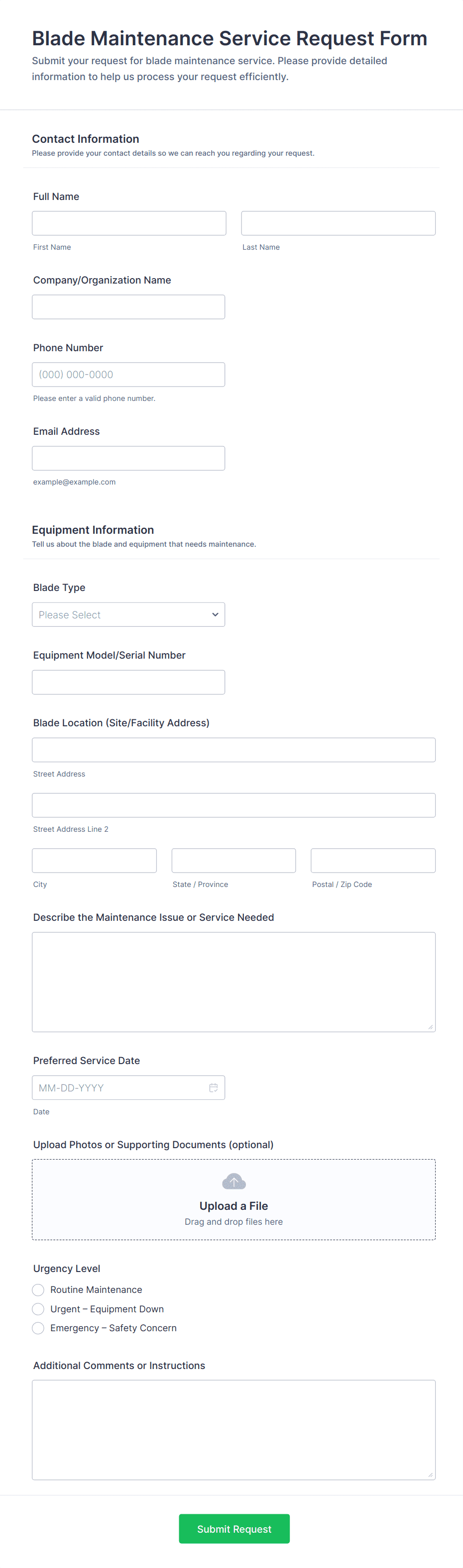 - Equipment maintenance request forms focus on equipment ID, issue description, severity, impact on operations, and preferred service timing.