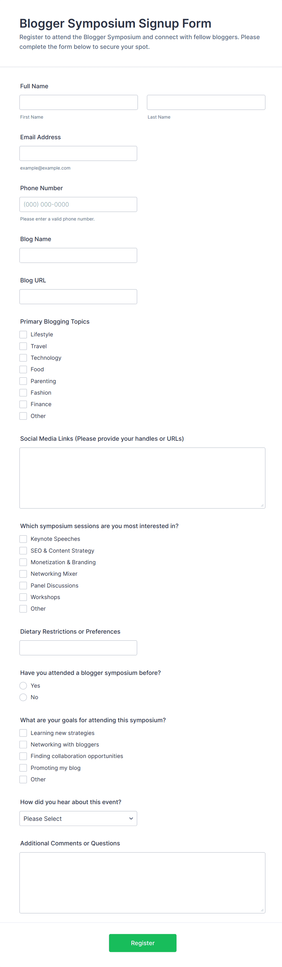• Session or Workshop Selection (dropdowns or checkboxes)
