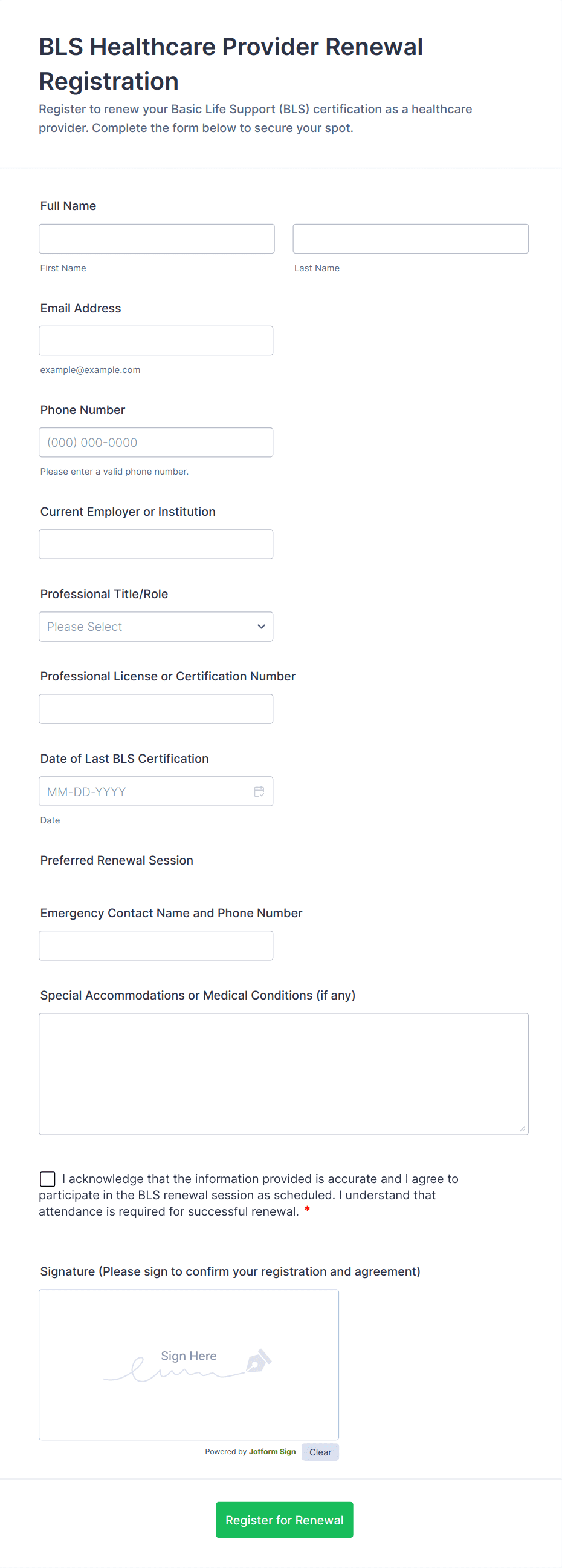 - Renewal-specific fields: Membership/License/Policy Number, Expiration Date, Document Upload (for certifications or proof of eligibility).