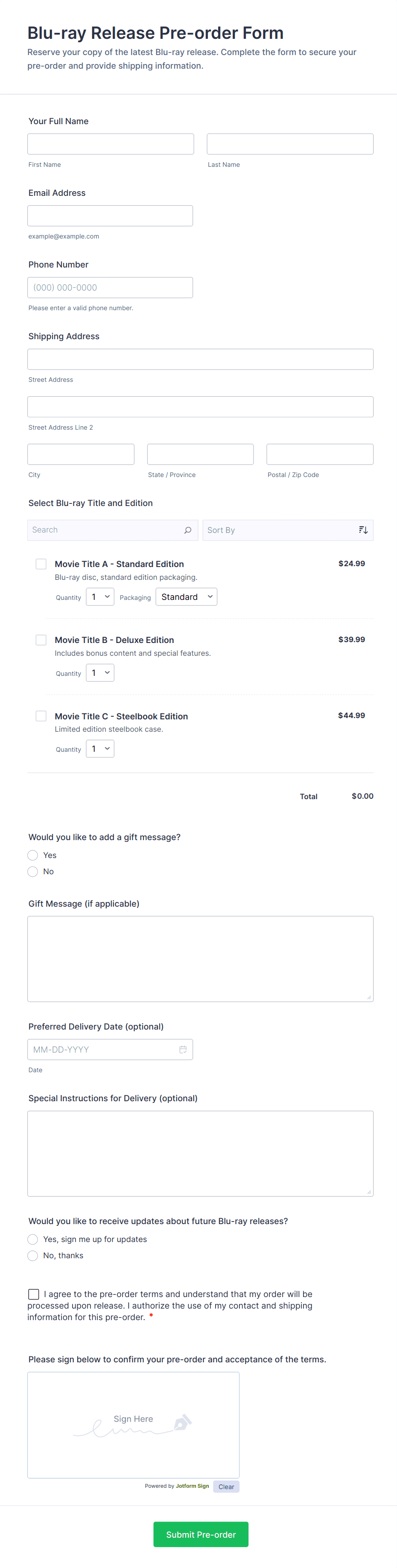 Preorder forms are specialized online forms designed to collect advance orders for products or services before they are officially released or available for general sale. Businesses, creators, and organizations use preorder forms to gauge demand, secure early sales, and streamline inventory planning for upcoming launches. These forms are commonly used for new product releases, limited-edition items, event tickets, seasonal goods, or even digital content. By allowing customers to reserve or purchase items ahead of time, preorder forms help businesses manage expectations, reduce the risk of overproduction, and build excitement around new offerings.
