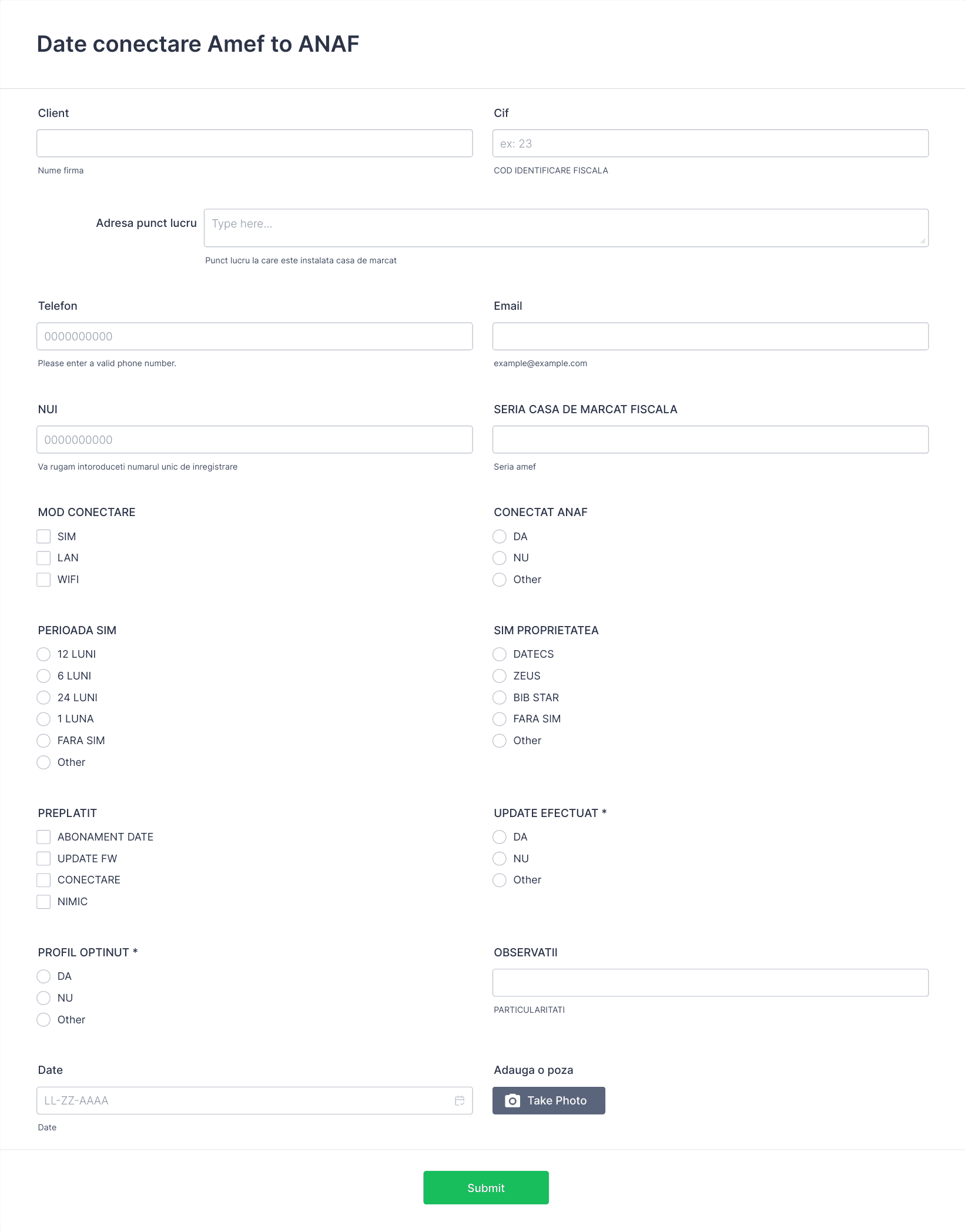 Common fields include contact details, job titles, service or product selections, payment information, feedback ratings, and document uploads, depending on the specific use case.