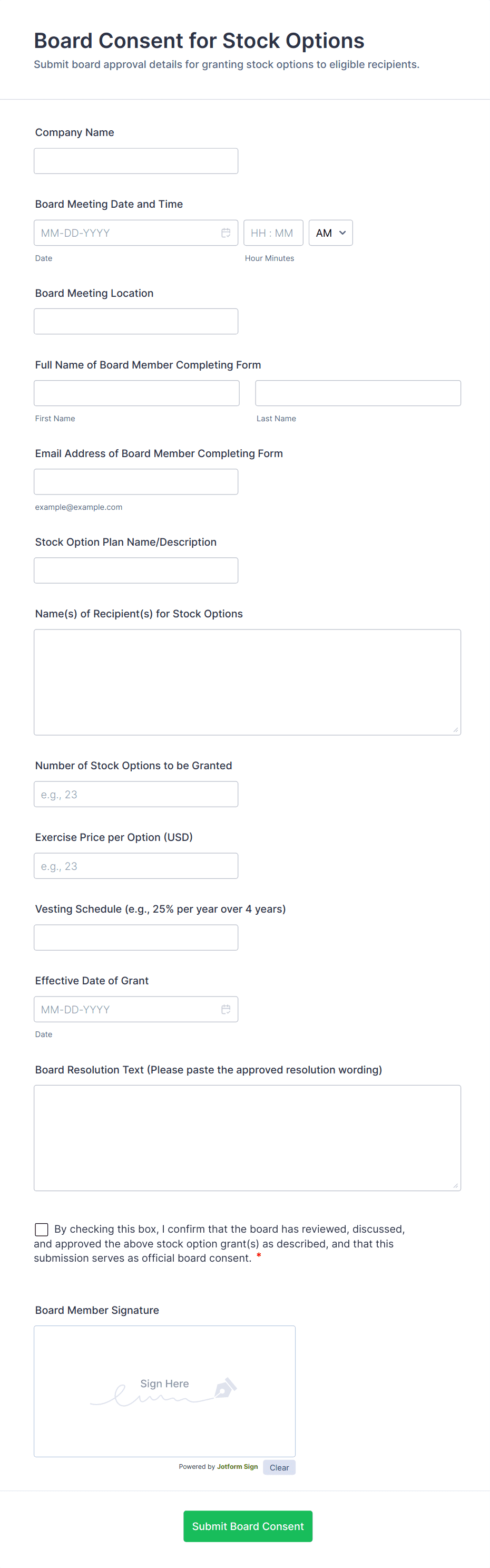The form templates here are for informational purposes only. Jotform is not providing legal, financial, or other advice, or implying that the forms are legally valid in all or any jurisdictions. Before using any such form, consult an attorney and/or other applicable professionals to make sure that the form meets your needs, legally and otherwise.