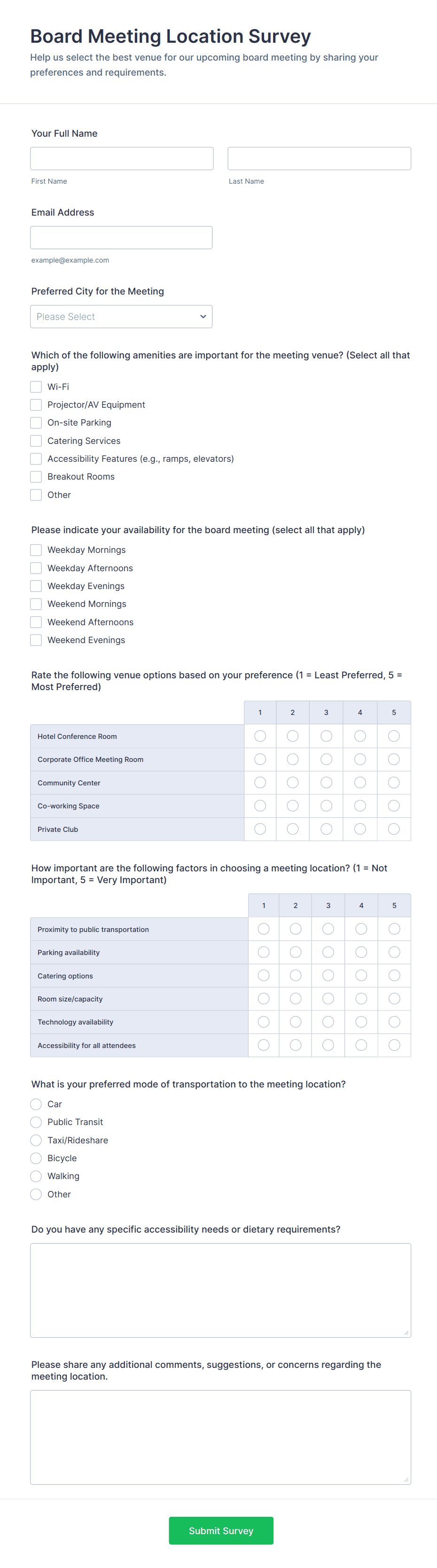 A meeting form is an online tool used to organize, schedule, and manage meetings by collecting essential information such as attendee details, agenda items, and feedback.