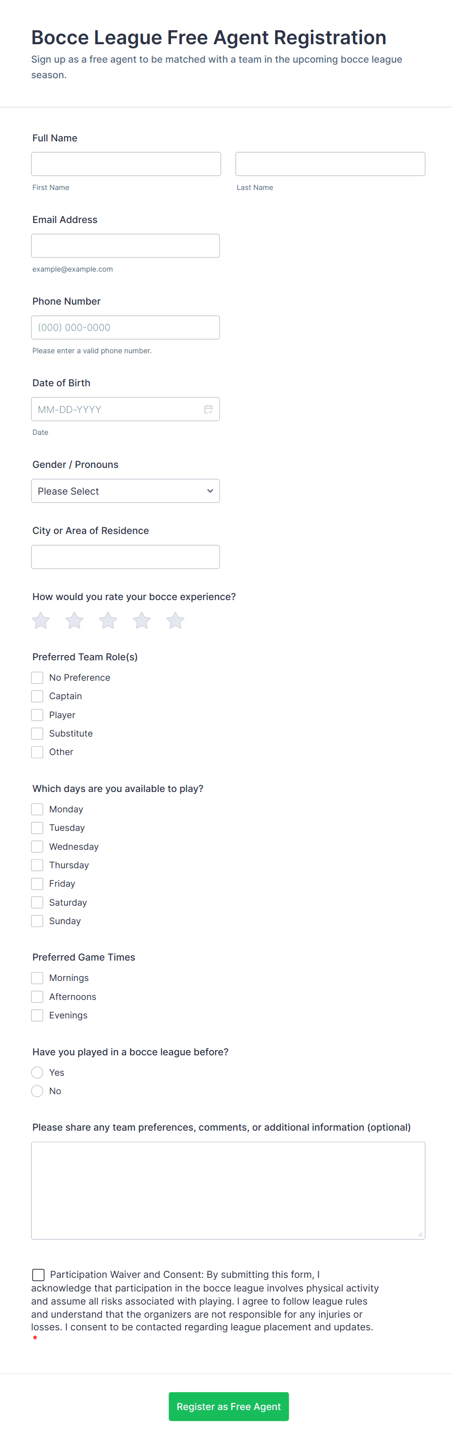 Bocce League Free Agent Registration Form helps leagues and community sports organizers collect online registrations from solo players and manage data collection for team placement using Jotform Form Templates.