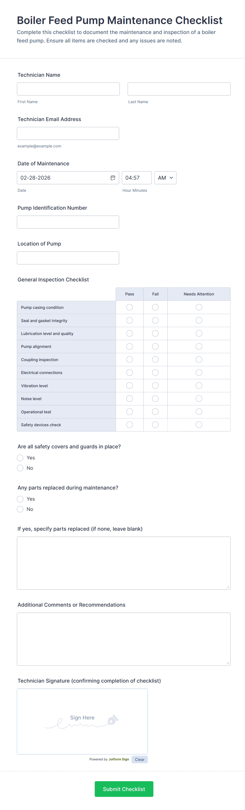 Track equipment upkeep with the Machine Maintenance Checklist Form for consistent data collection across sites, helping technicians and supervisors document inspections, replacements, and outcomes with every form submission in Jotform.