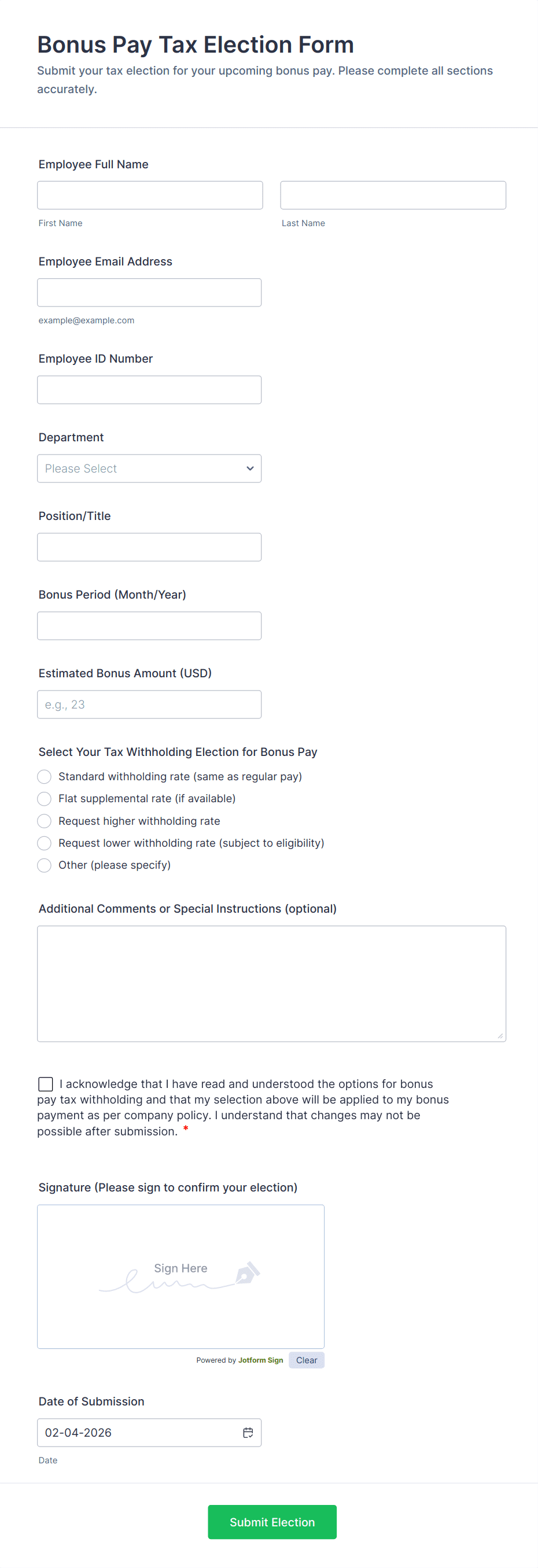 Absolutely. Jotform’s templates can be fully customized to include fields and requirements specific to local, state, or federal tax regulations, ensuring compliance with the relevant laws.