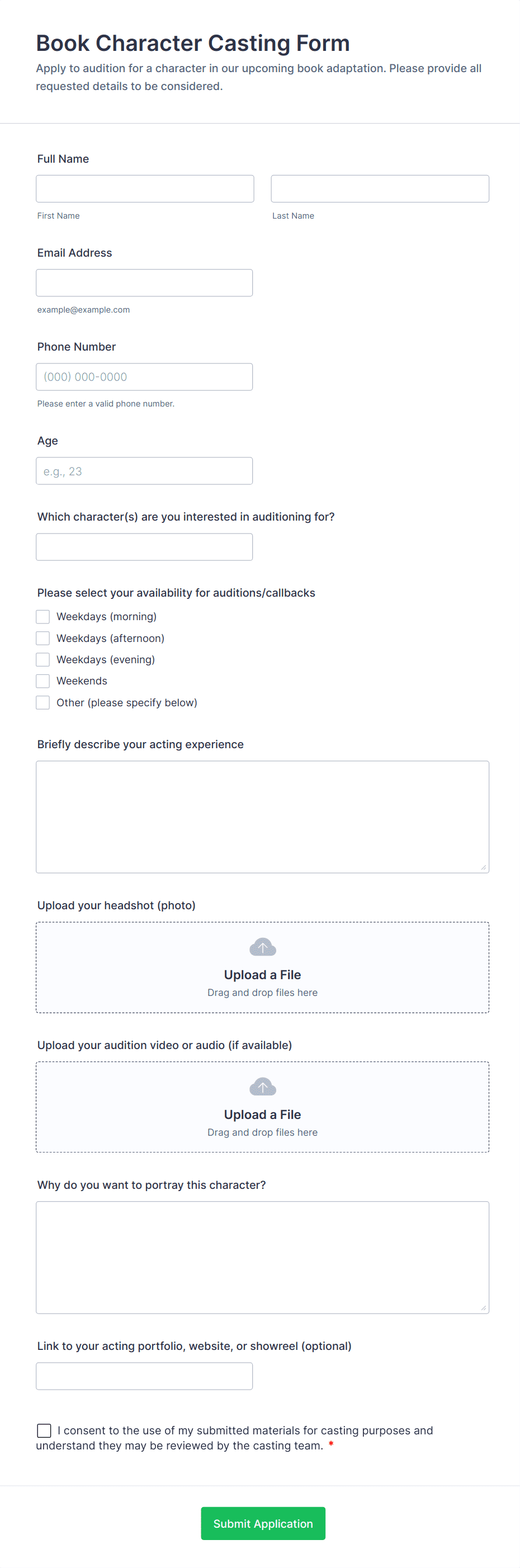 Include essentials that help your casting team evaluate candidates quickly, such as basic contact information, the character(s) the applicant wants to portray, audition or callback availability, and optional links to a portfolio or showreel.