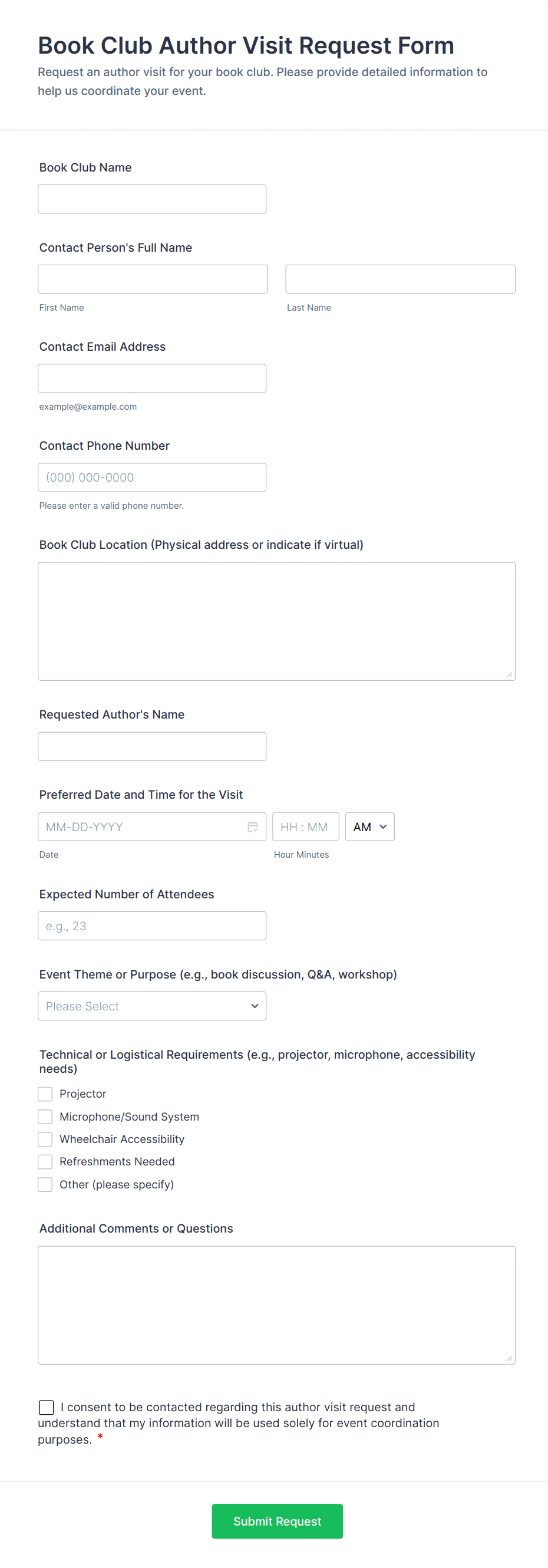 Event request forms are structured documents used to submit, review, and manage requests to plan or host an event. They help organizers collect consistent details like event purpose, dates, location needs, audience size, budget, and required services so events can be approved and coordinated efficiently. Event request forms are commonly used by companies, schools, nonprofits, venues, and community organizations for internal events, workshops, trainings, celebrations, marketing events, and public programs. By standardizing event requests, these forms reduce back-and-forth, improve planning accuracy, and create a clear record of event requirements from the start.