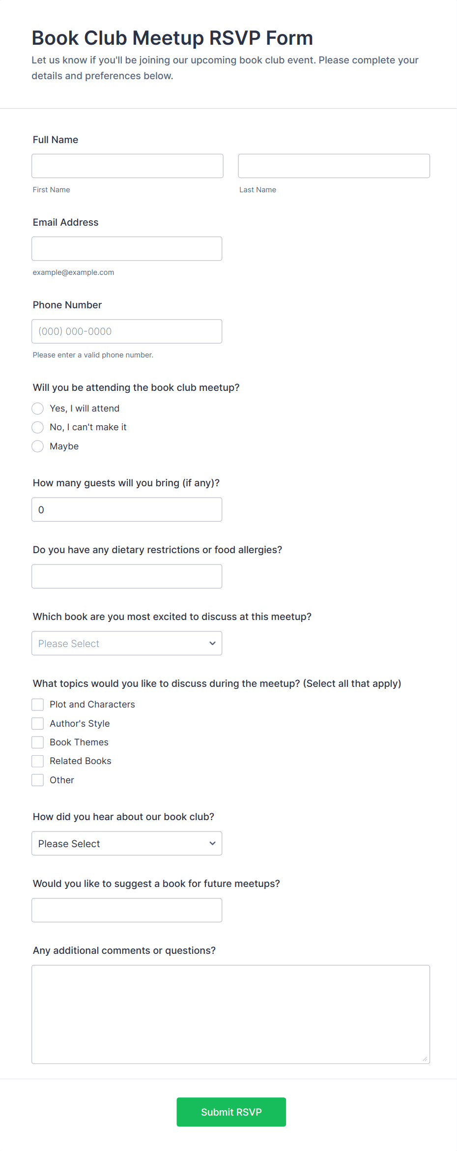 RSVP forms are digital tools designed to collect responses from invitees regarding their attendance at events, gatherings, meetings, or special occasions. Whether you’re organizing a wedding, corporate seminar, birthday party, or community event, RSVP forms streamline the process of confirming guest participation, gathering essential details like meal preferences, plus-ones, or special requirements. These forms help event organizers efficiently manage headcounts, plan logistics, and ensure a smooth experience for both hosts and attendees. The versatility of RSVP forms means they can be tailored for formal galas, casual get-togethers, virtual webinars, or even recurring club meetings.