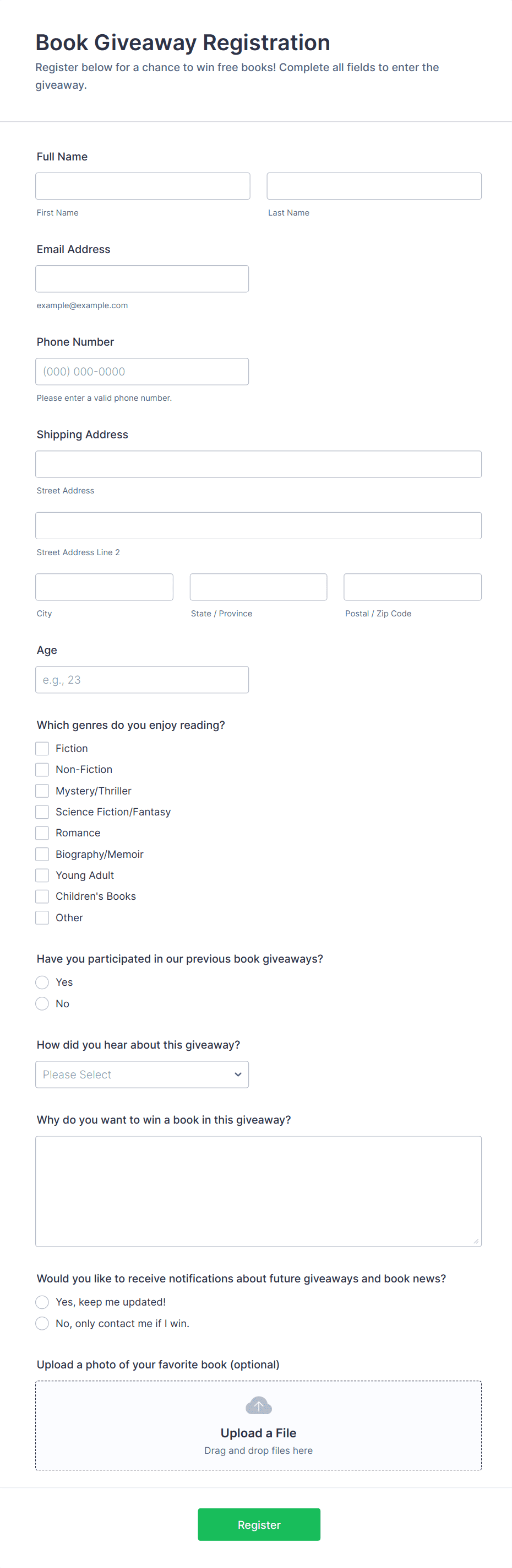 Giveaway forms are specialized online forms designed to facilitate the organization and management of contests, sweepstakes, raffles, and promotional giveaways. These forms are used to collect participant information, ensure fair entry processes, and streamline the selection of winners. Businesses, nonprofits, influencers, and event organizers often use giveaway forms to boost engagement, grow their audience, collect leads, or promote products and services. Typical use cases include social media contests, product launches, event promotions, charity raffles, and customer appreciation campaigns.
