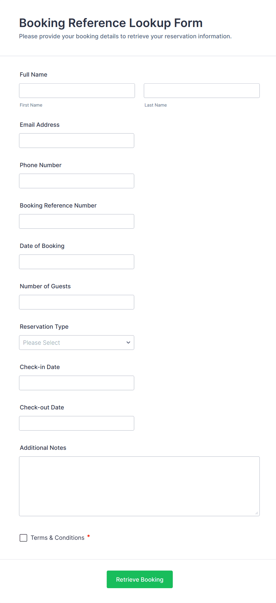 Reservation forms are digital tools designed to streamline the process of booking or reserving services, spaces, or items. They are commonly used by businesses and organizations to manage appointments, event registrations, table bookings, facility rentals, hotel stays, equipment loans, and more. By collecting essential information such as names, contact details, preferred dates and times, and specific requirements, reservation forms help ensure a smooth and organized scheduling process. Whether you run a restaurant, hotel, clinic, event venue, or rental service, reservation forms can significantly reduce manual coordination and minimize double bookings or scheduling conflicts.