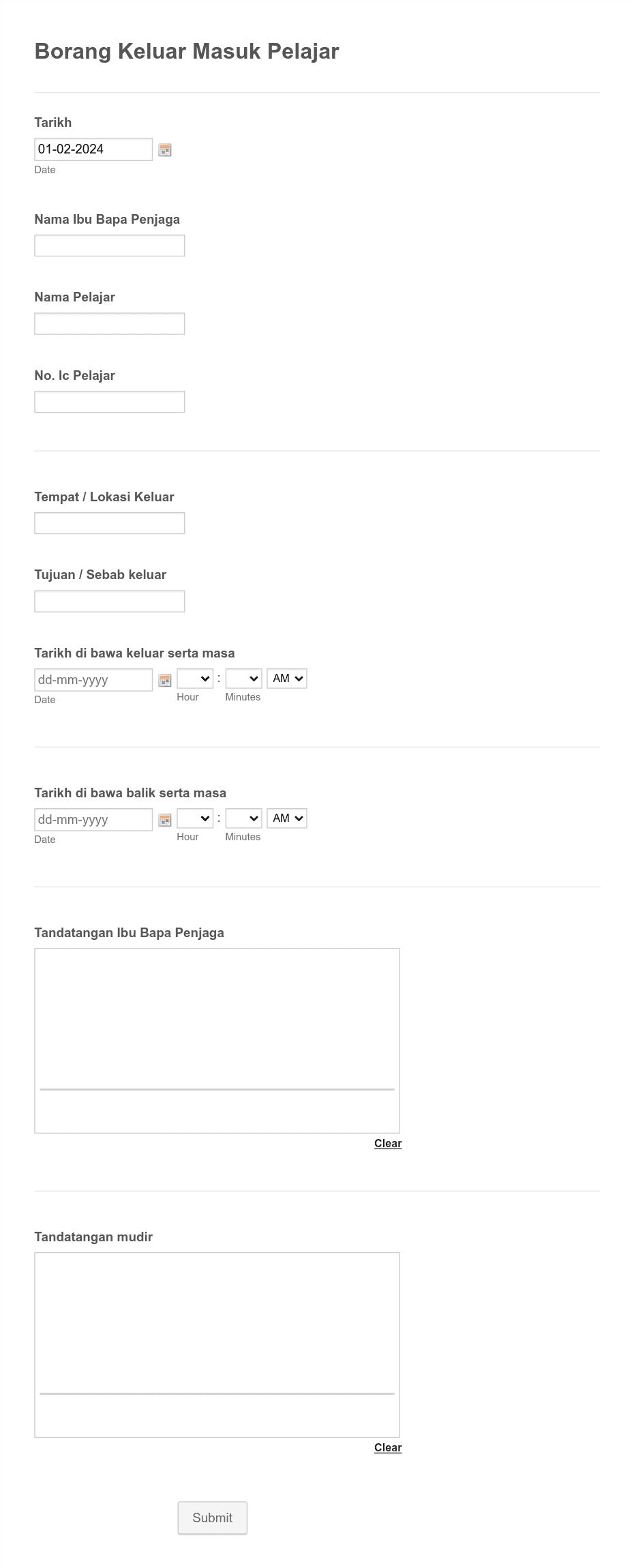 Here is a simple solution to track student’s absence information. Collect student’s and parent’s name, contact information, dates of absence, etc. through a school absence form.