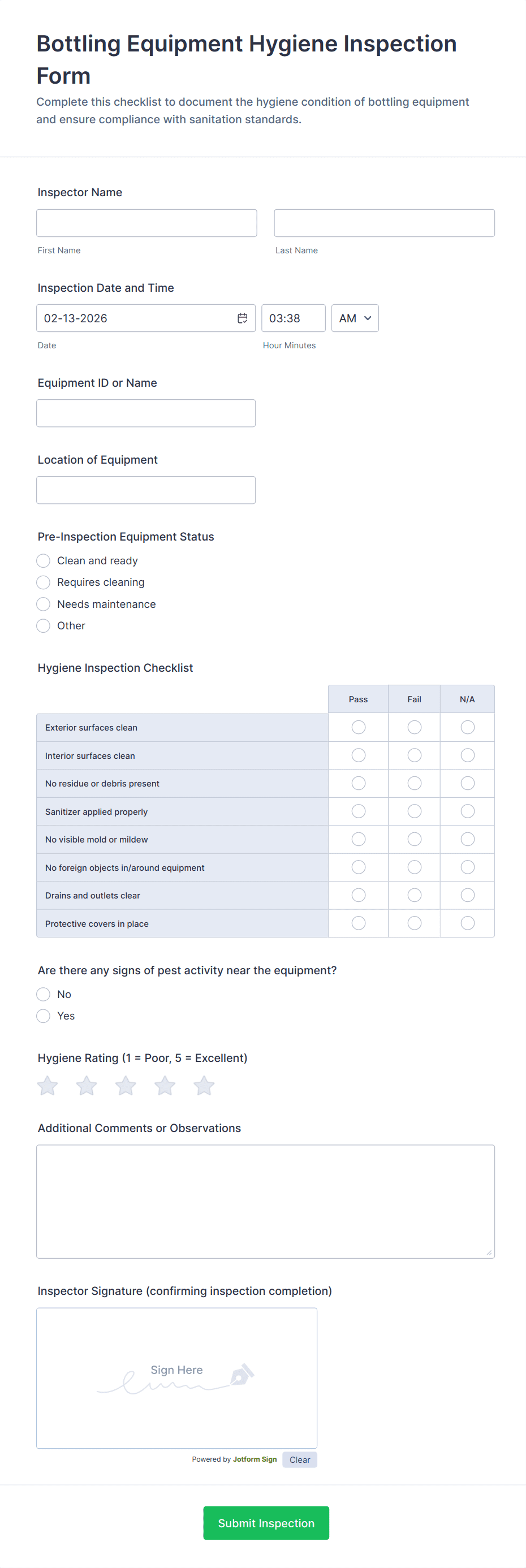 Creating an effective inspection form with Jotform is straightforward and highly customizable, allowing you to address the unique requirements of your inspection process. Whether you’re conducting safety audits, equipment checks, or property walkthroughs, Jotform’s platform ensures your forms are comprehensive, user-friendly, and accessible from any device.