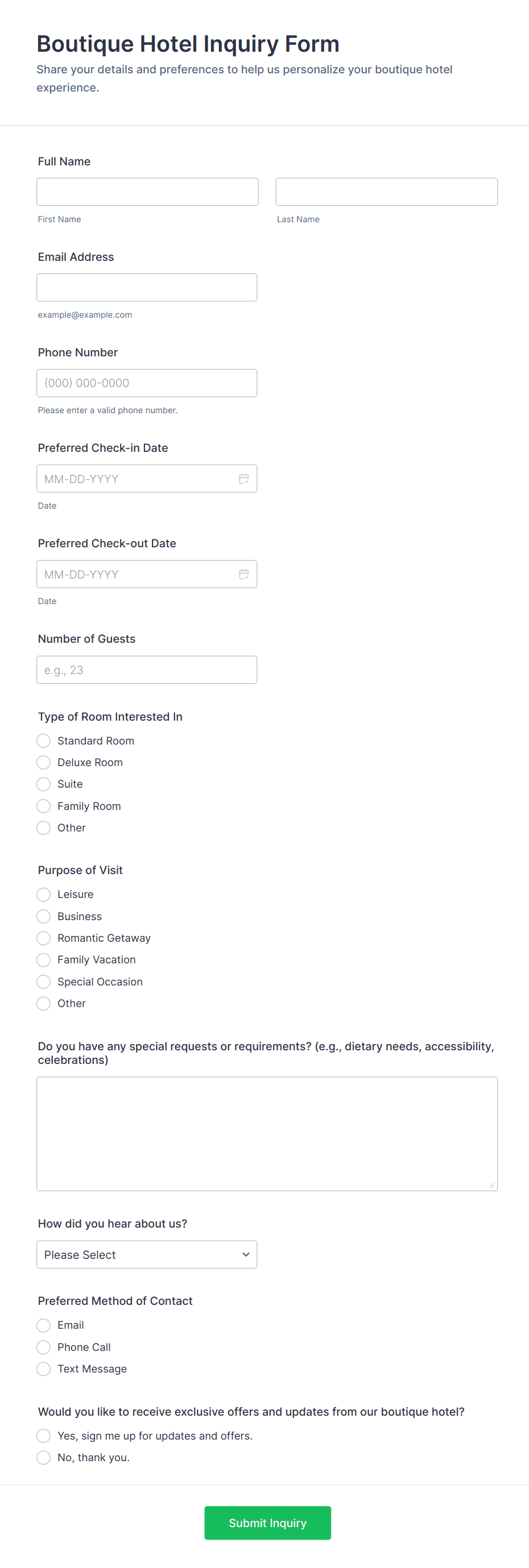- Event inquiry forms could ask for attendee details, event dates, and special requirements