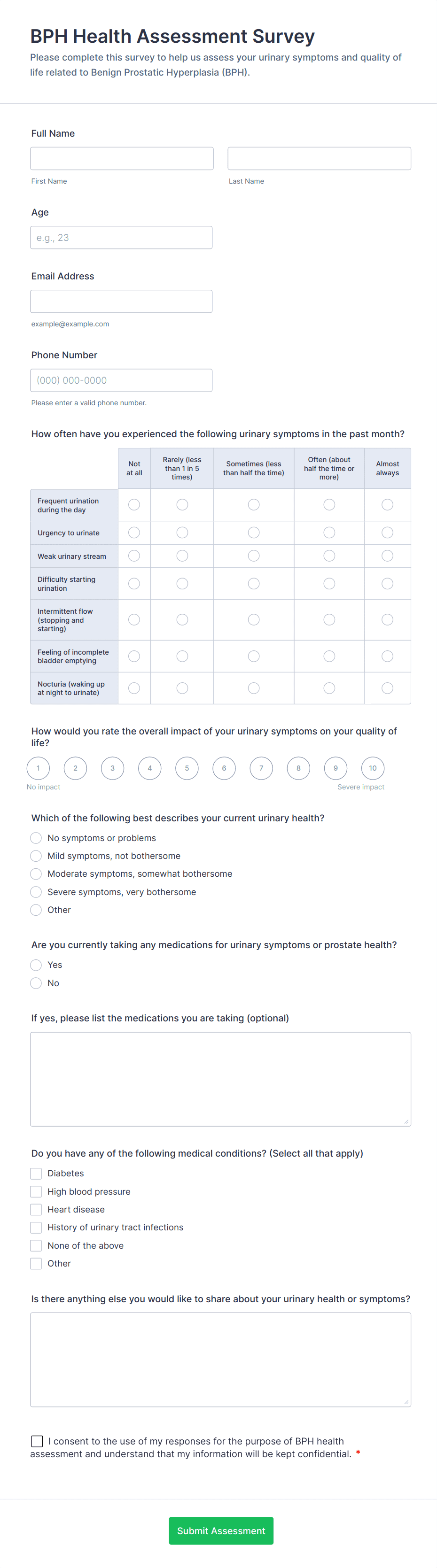 • File upload fields for medical documents or images, if needed.