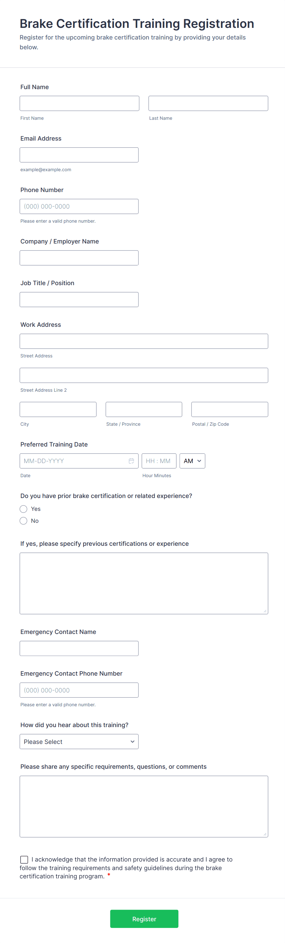 A Training Registration Form is a user-friendly form template designed to streamline the registration process for training providers, corporate HR teams, nonprofits, and event management teams.