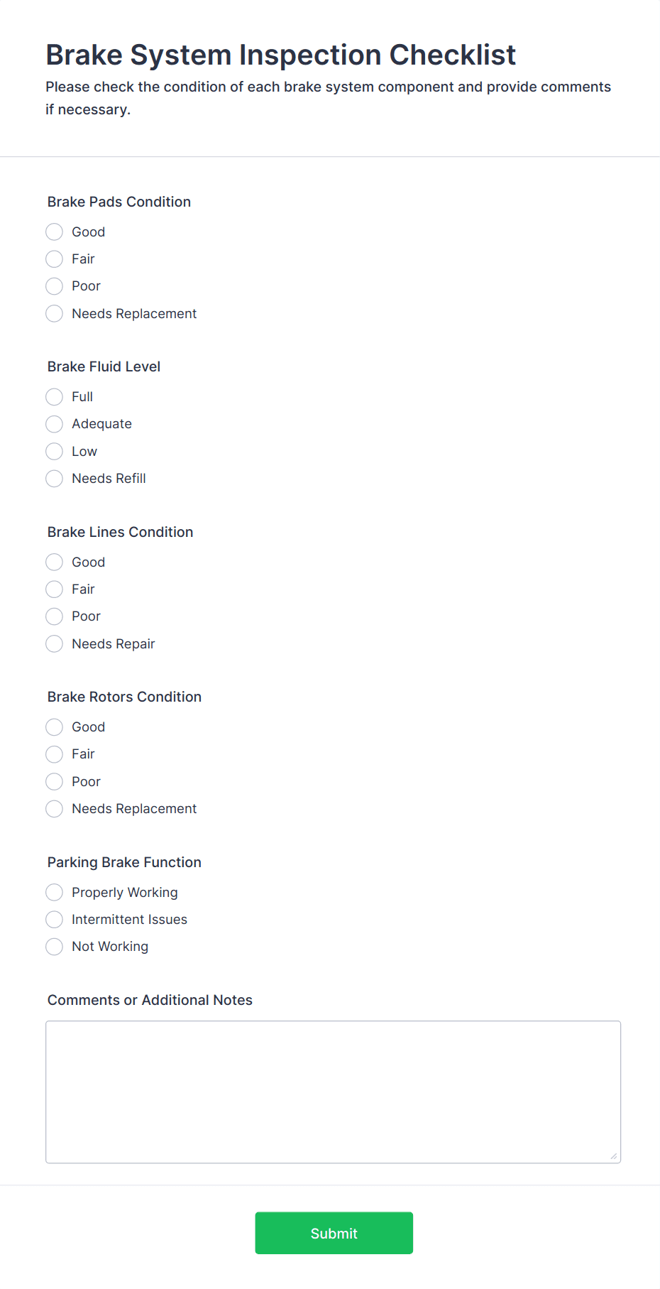 Perform weekly police vehicle inspections for your precinct with this free online Vehicle Inspection Form. Easy to customize and fill out on any device.