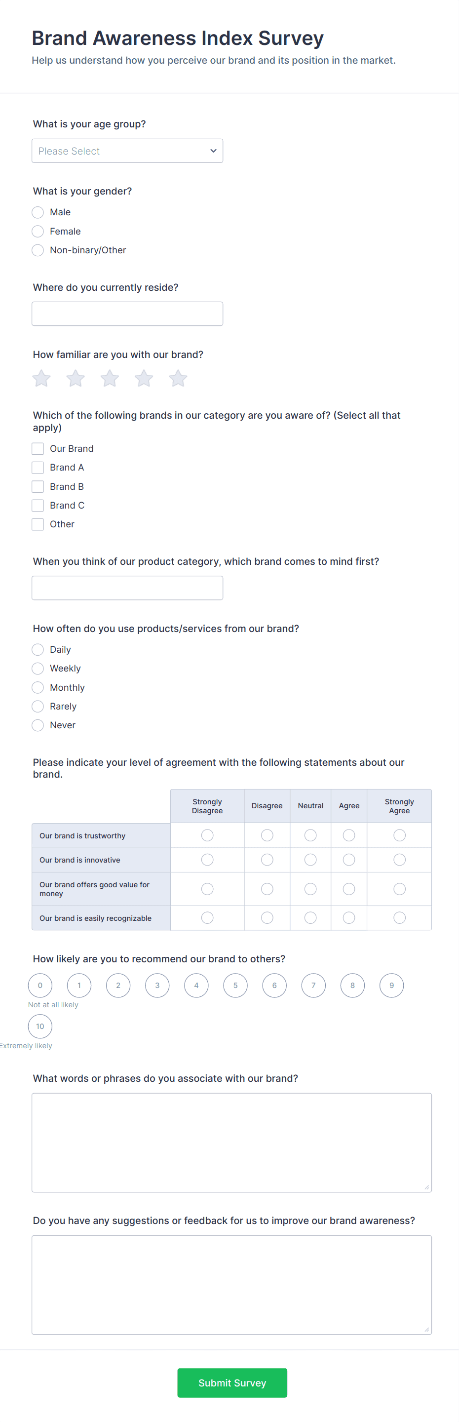 • Brand Awareness Surveys: Include questions about brand recall, recognition, and perception.