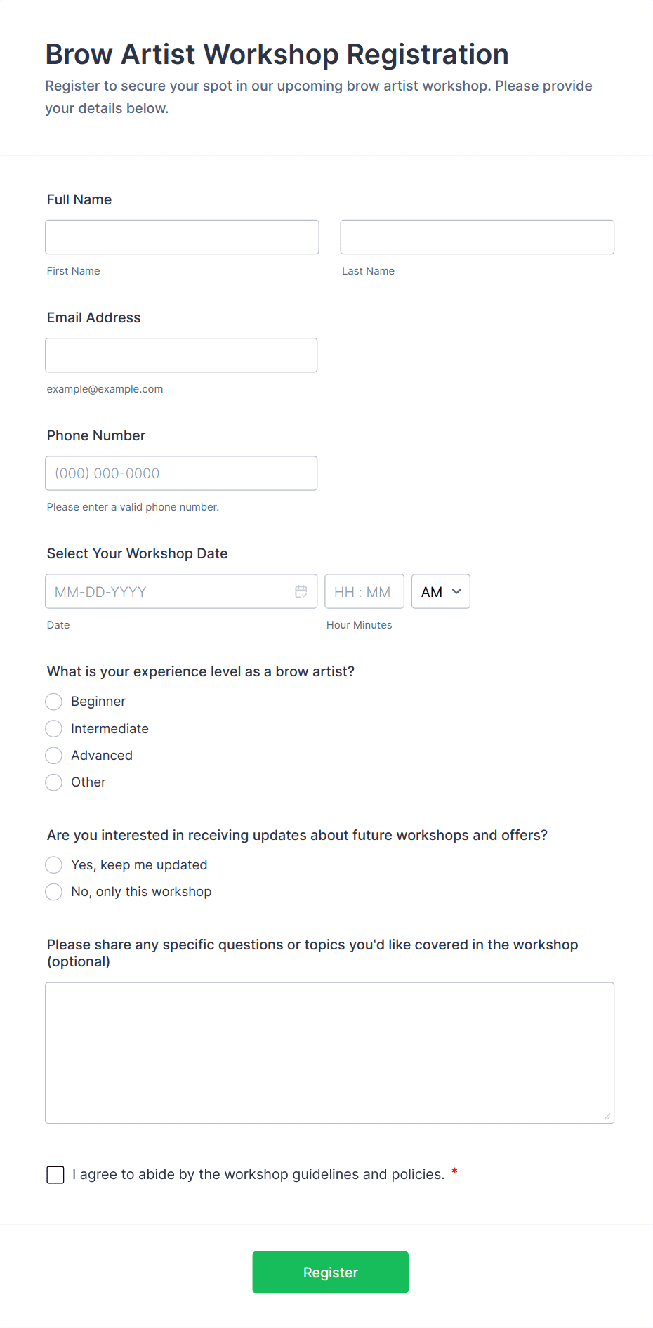 A Workshop Registration Form Template is a pre-designed online form that helps organizers collect participant information, preferences, and payments for workshops or training events.