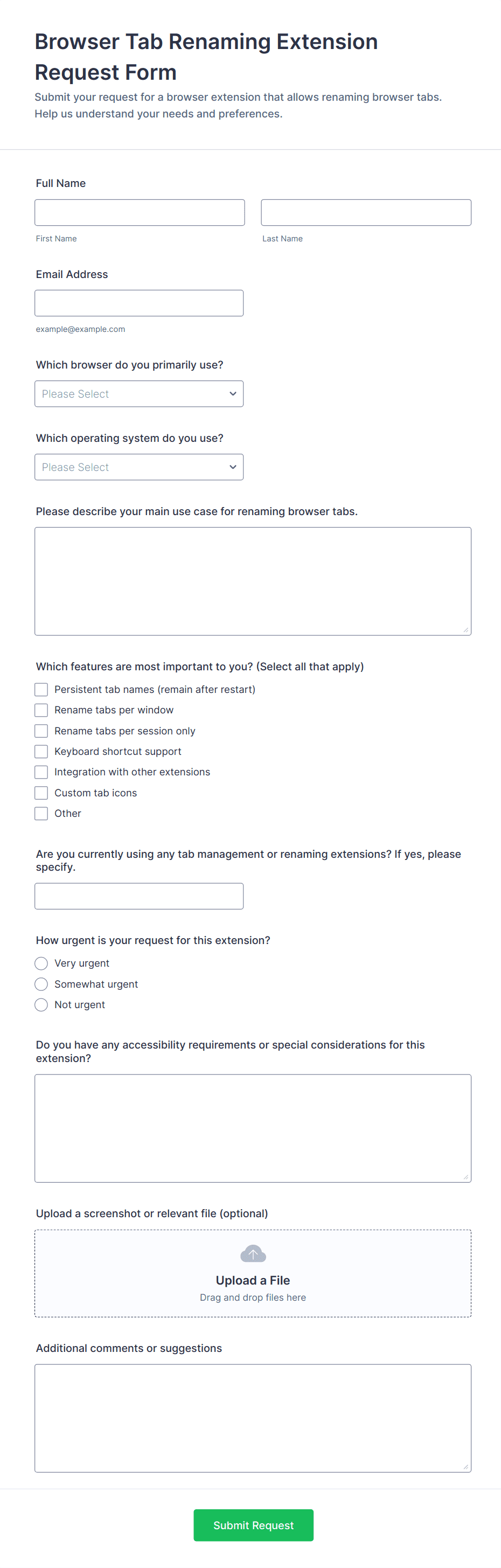 A feature request form is used by companies to collect suggestions either from their customers or from their teams about new features they want to see added to products or services. Fully customizable.