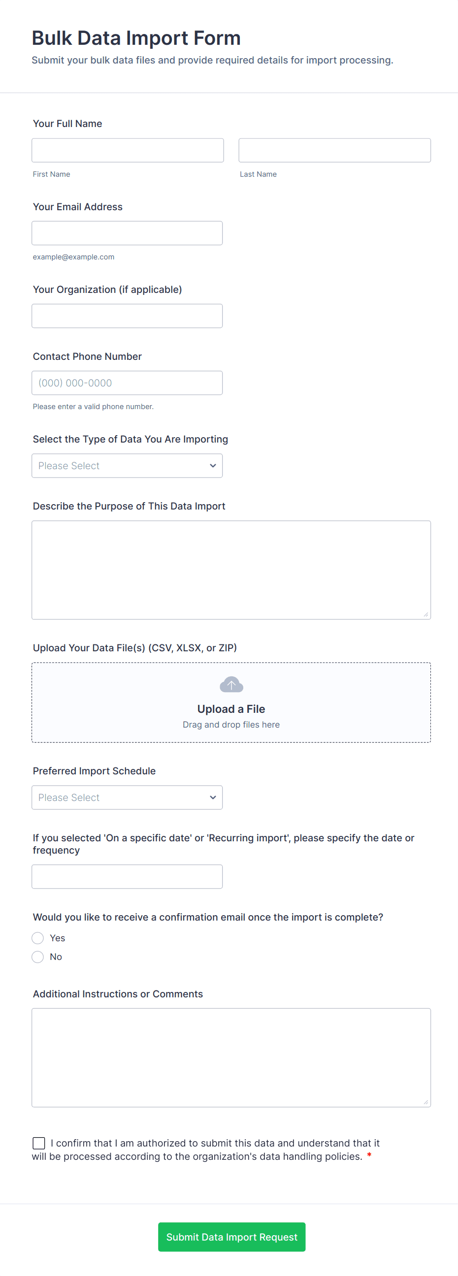 File Upload Forms are specialized online forms designed to collect files, documents, images, or other digital assets directly from users. These forms are commonly used in scenarios where individuals or organizations need to gather supporting materials, such as job applications with resumes, event registrations with ID proofs, homework submissions, design requests, or client onboarding documents. The versatility of File Upload Forms makes them essential for businesses, educational institutions, creative agencies, HR departments, and service providers who require a secure and efficient way to receive files from clients, students, or collaborators.