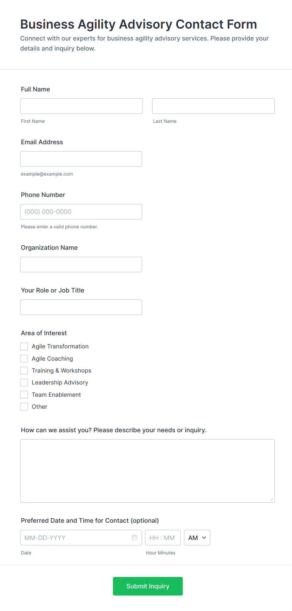 • For specialized use cases, include dropdowns (e.g., inquiry type), checkboxes (e.g., preferred contact method), or file upload fields (for attachments or screenshots).