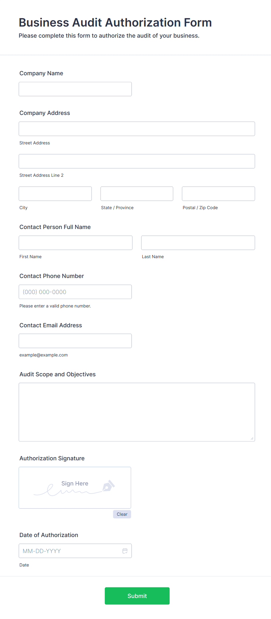 An authorization form is a document used to obtain formal consent or permission from an individual or organization to perform a specific action, such as releasing information, processing payments, or granting access.