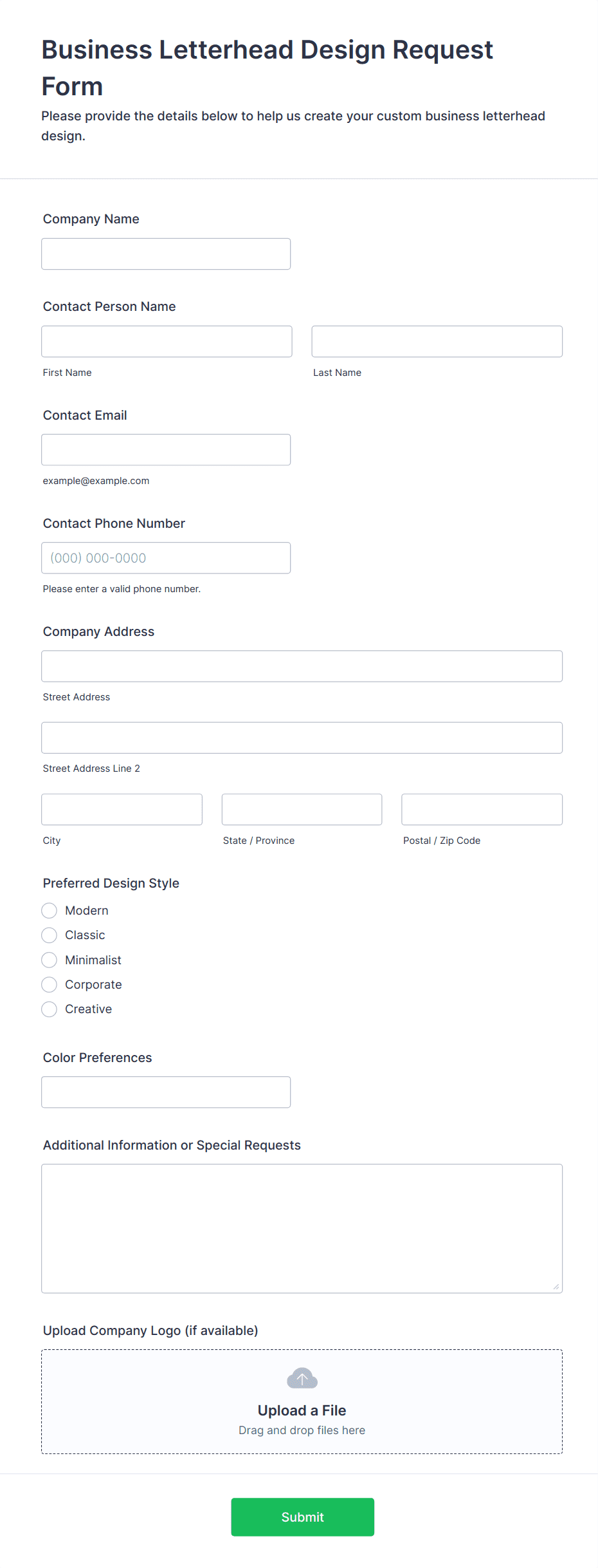 A business form template is a pre-designed digital form used to collect, process, and manage information for various business operations, such as client intake, employee onboarding, or order processing.