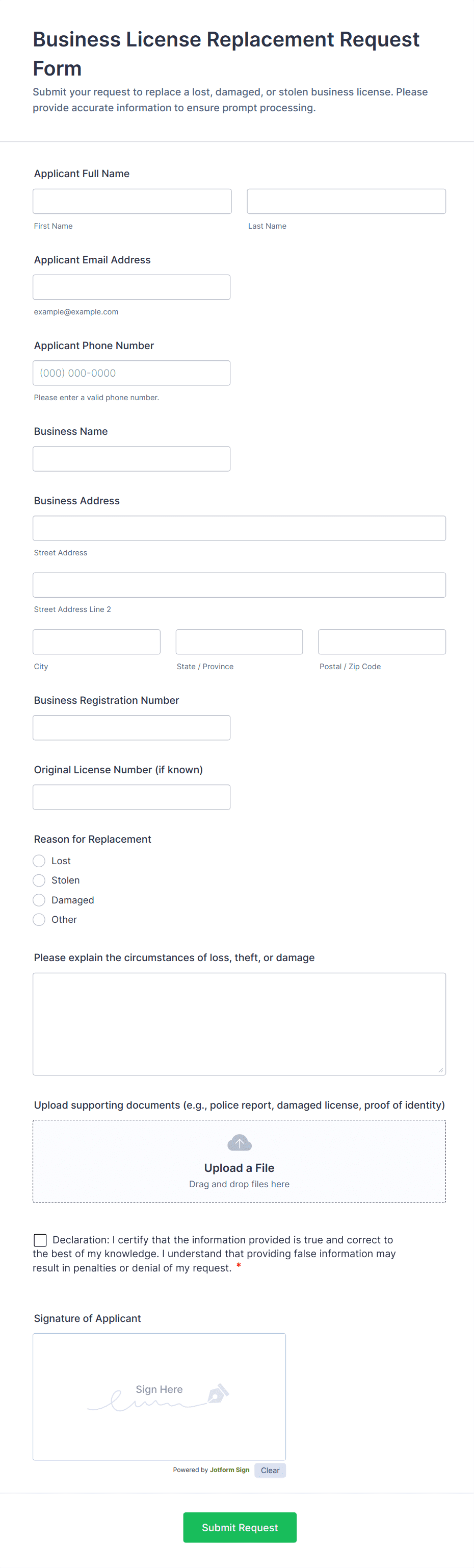 With Jotform, users can easily create, customize, and deploy request forms tailored to their specific needs. Thanks to Jotform’s intuitive drag-and-drop Form Builder, anyone can design a professional-looking request form without any coding knowledge. Users can add fields, set up conditional logic, integrate with payment gateways, and automate notifications to streamline the entire request process. Submissions are automatically organized in Jotform Tables, making it simple to track, manage, and respond to requests efficiently. Whether you’re a business, school, nonprofit, or government agency, Jotform’s request forms help you collect and process requests with ease.