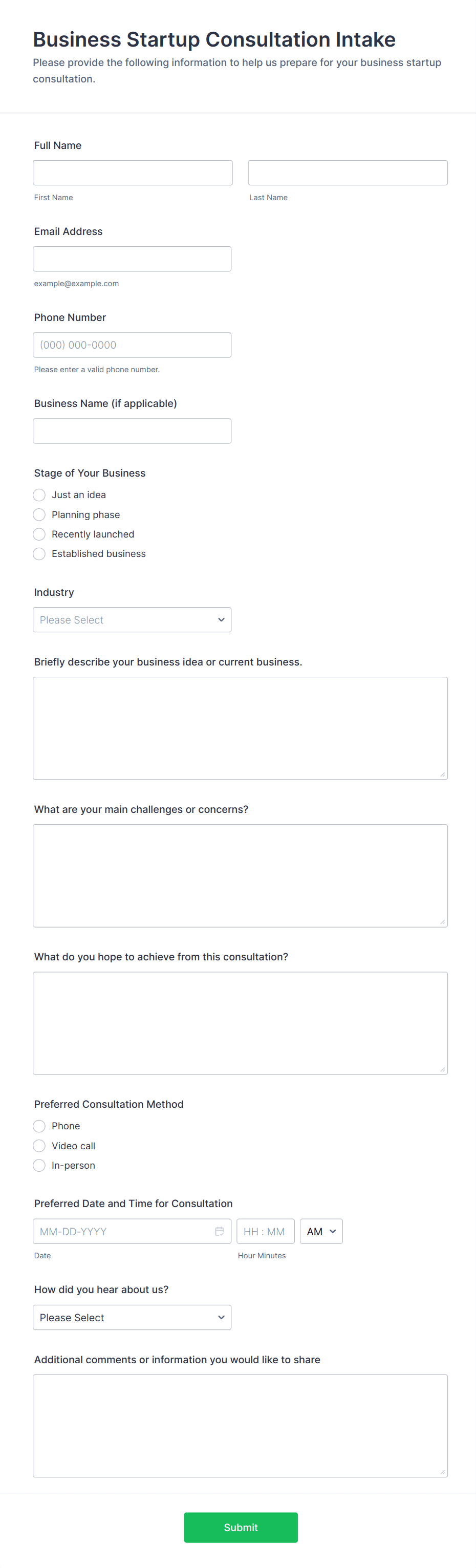 Intake forms are essential tools used to gather preliminary information from clients, patients, customers, or participants before providing a service or beginning a process. These forms streamline the onboarding process by collecting relevant details such as contact information, background data, preferences, and specific needs. Intake forms are widely used across various industries, including healthcare (patient intake), legal (client intake), education (student intake), human resources (employee onboarding), and service-based businesses (client consultations). By standardizing the information-gathering process, intake forms help organizations ensure consistency, improve efficiency, and deliver personalized experiences.