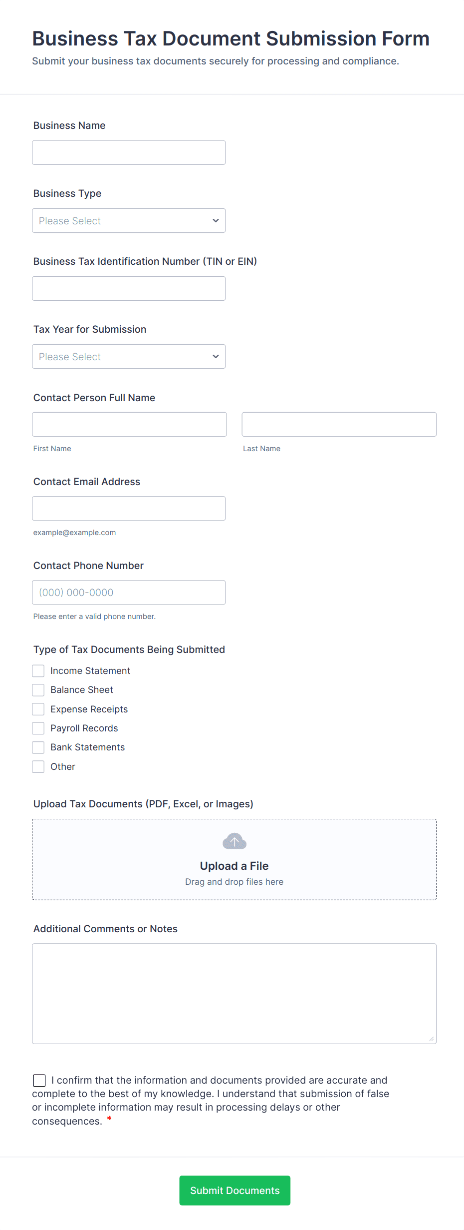Common fields include personal or business identification details, tax identification numbers, income amounts, deductions, filing status, and supporting documentation such as receipts or invoices.
