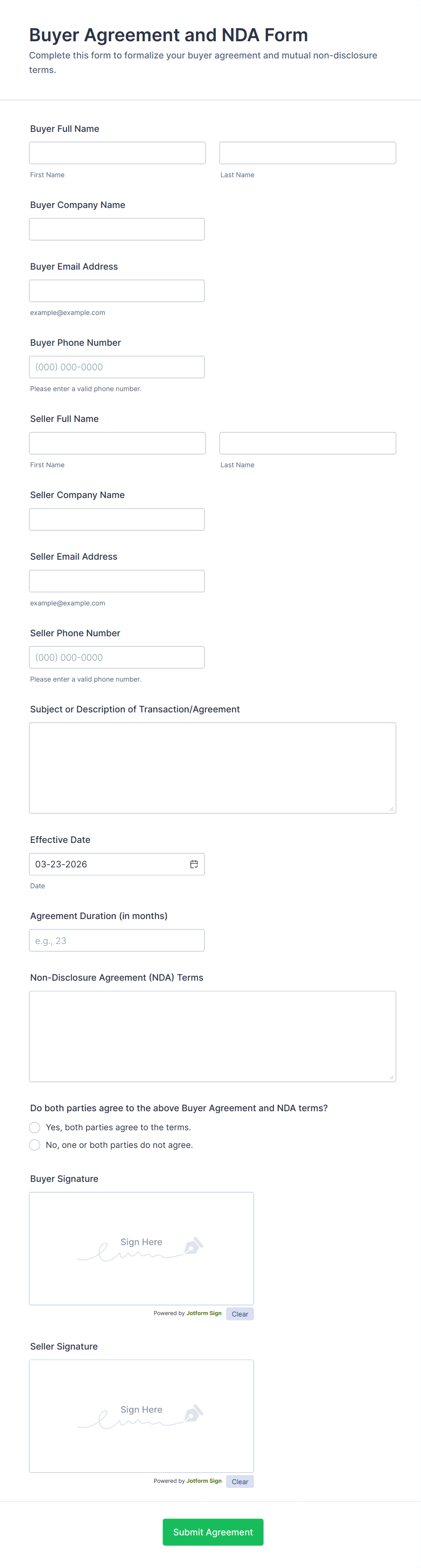 • For NDAs, specify confidential information, obligations, and duration.