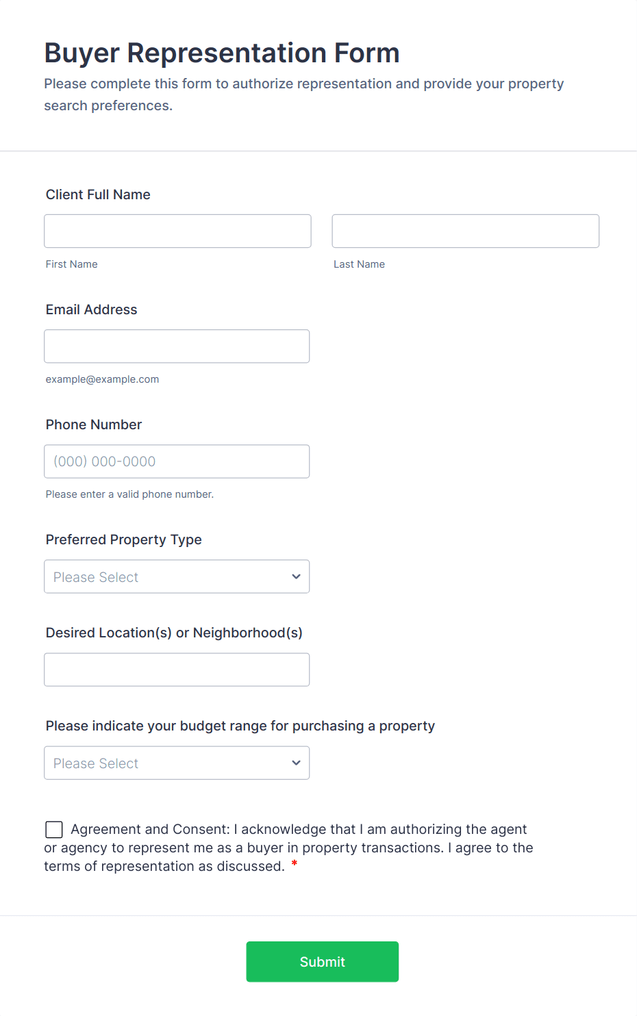 A Real Estate Client Registration Form is a form template designed to help real estate agents, brokers, and agencies efficiently collect, organize, and manage client information.