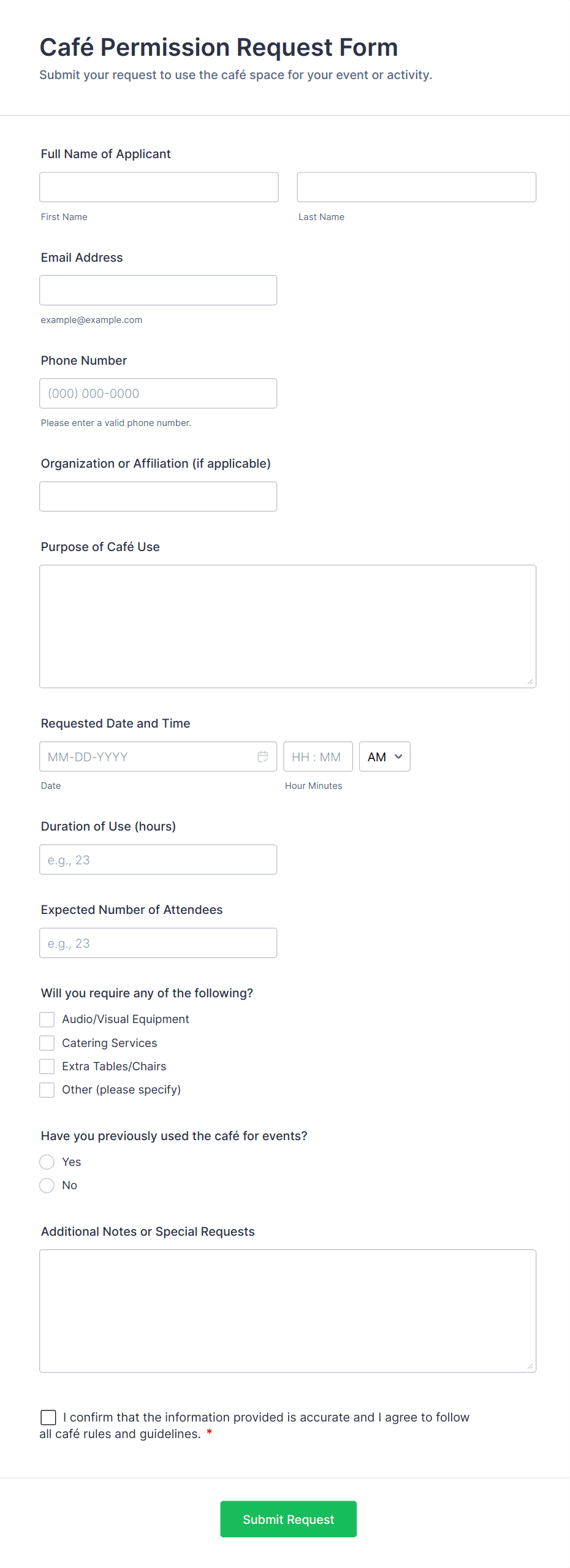 Event request forms are structured documents used to submit, review, and manage requests to plan or host an event. They help organizers collect consistent details like event purpose, dates, location needs, audience size, budget, and required services so events can be approved and coordinated efficiently. Event request forms are commonly used by companies, schools, nonprofits, venues, and community organizations for internal events, workshops, trainings, celebrations, marketing events, and public programs. By standardizing event requests, these forms reduce back-and-forth, improve planning accuracy, and create a clear record of event requirements from the start.
