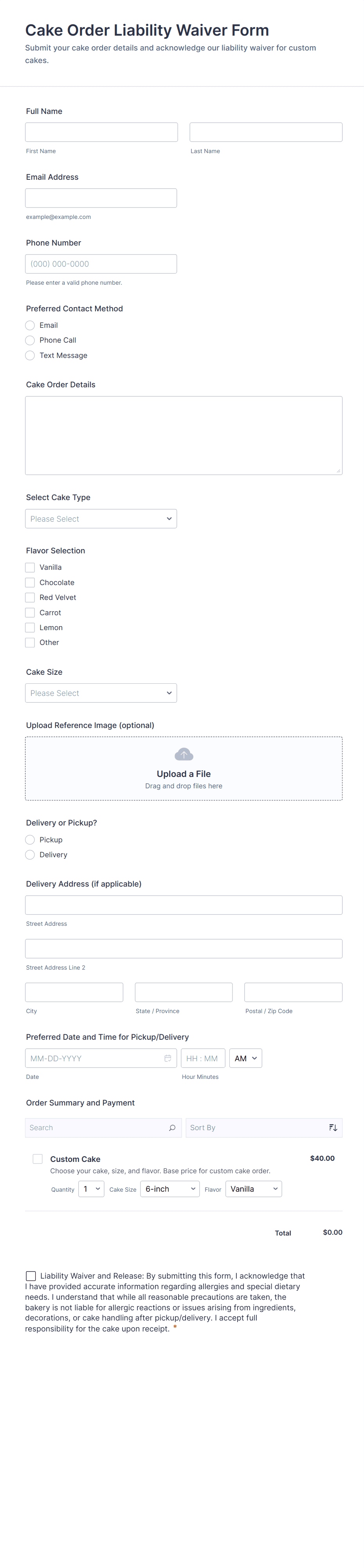 In summary, Cake Order Forms can be tailored to fit a wide range of business models and customer needs, ensuring efficient order management and a seamless experience for both the business and its clients.