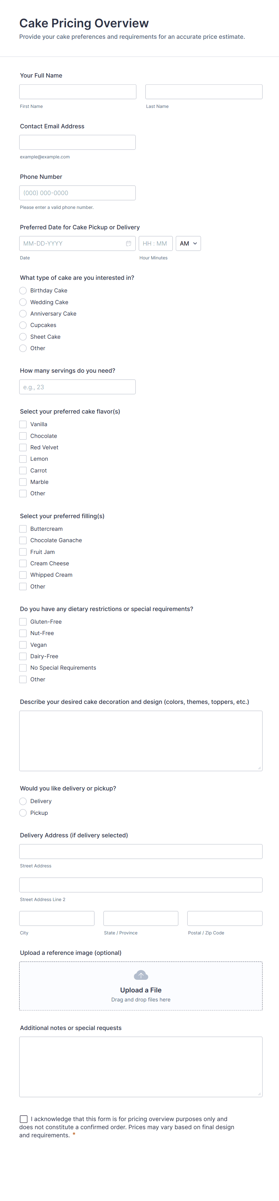 Cake Order Forms are specialized online forms designed to streamline the process of ordering cakes for various occasions, such as birthdays, weddings, corporate events, and other celebrations. These forms allow bakeries, home bakers, and cake shops to collect detailed information from customers, including cake type, size, flavor, design preferences, delivery or pickup details, and payment information. By using Cake Order Forms, businesses can efficiently manage orders, reduce errors, and ensure that every customer’s unique requirements are captured accurately. Whether you’re taking custom cake orders, offering a menu of standard cakes, or managing bulk event requests, these forms help simplify the entire ordering workflow.