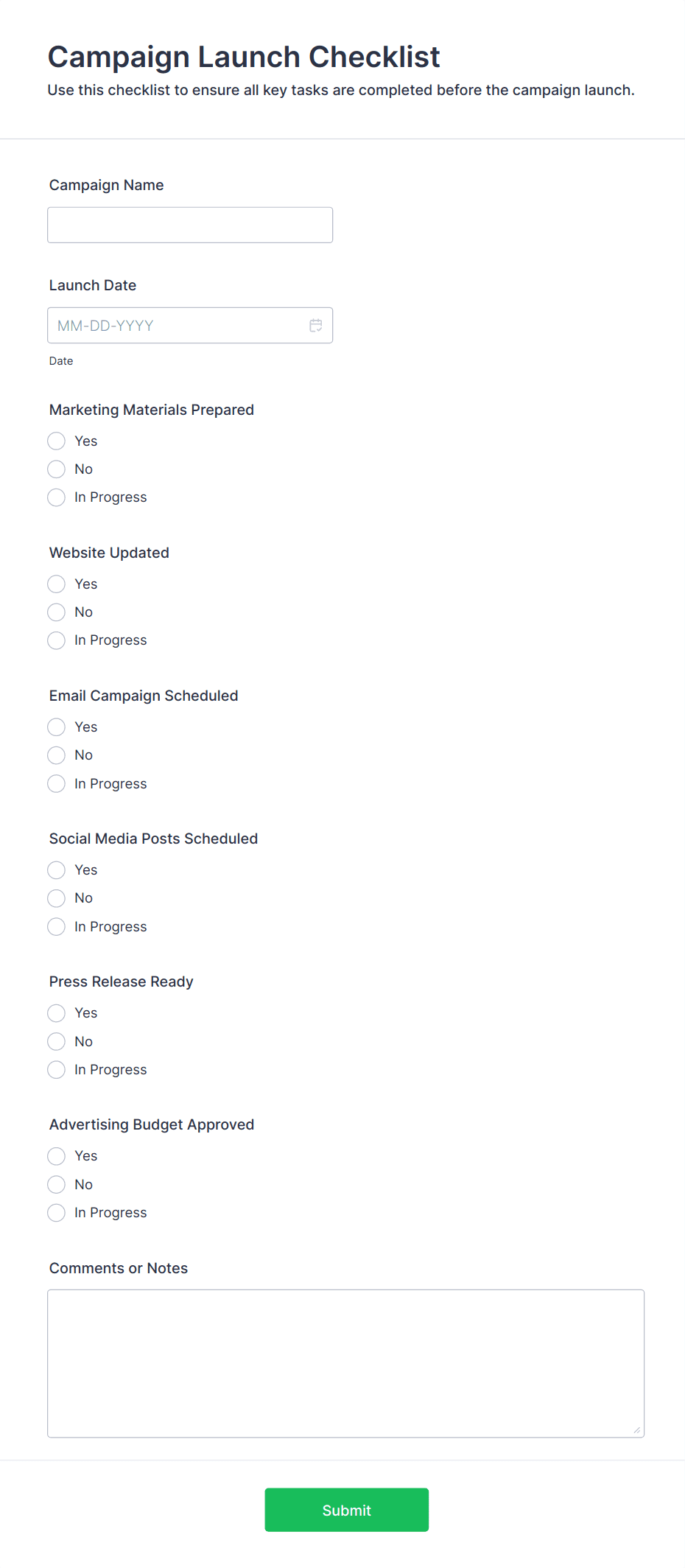 Checklist forms usually contain a list of tasks or items, checkboxes for completion, and may include fields for names, dates, comments, signatures, or supporting documentation.