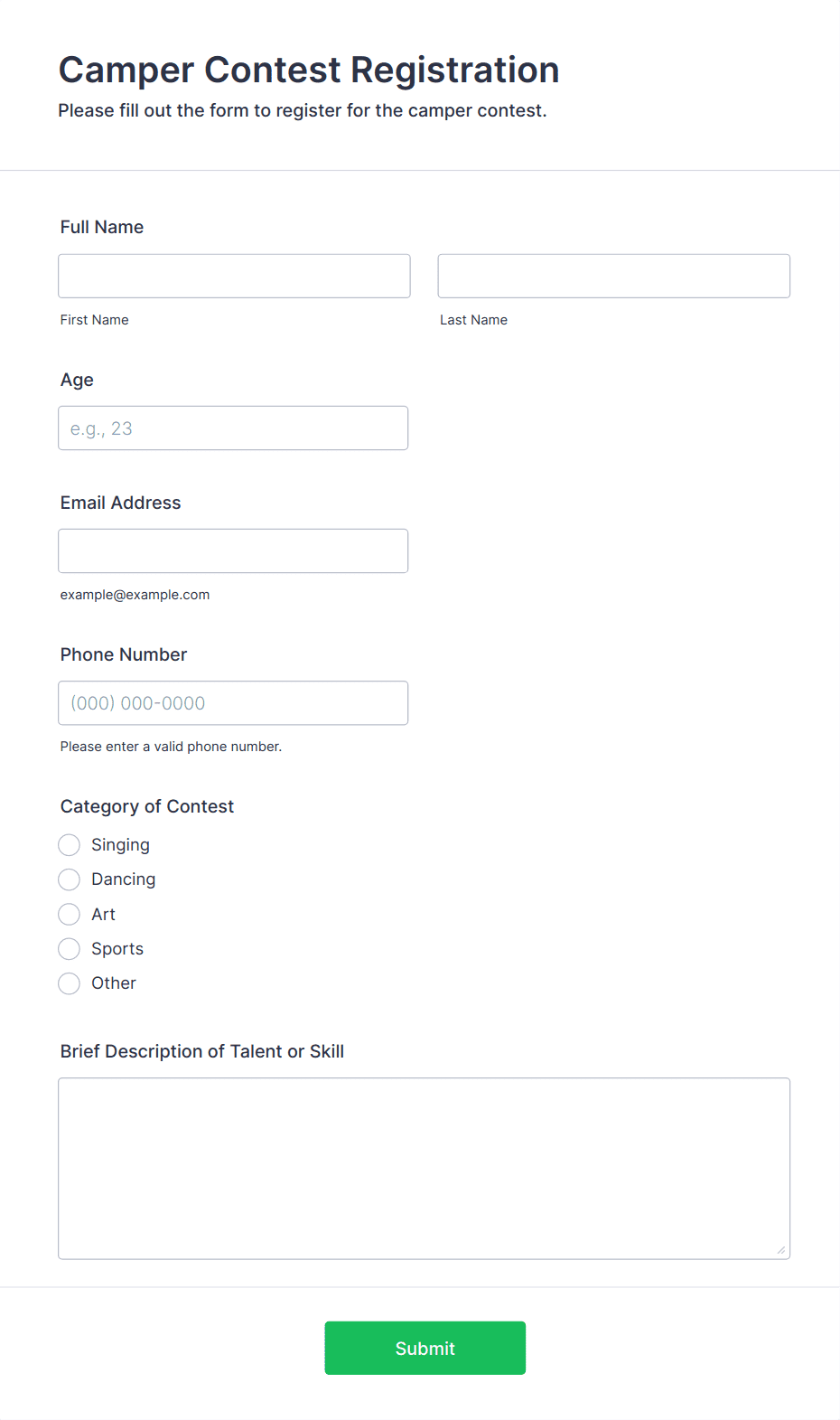 Contest Registration Forms are specialized online forms designed to collect participant information for a wide variety of contests, competitions, and challenges. Whether you’re organizing a talent show, art competition, academic quiz, sports tournament, or online giveaway, these forms streamline the process of gathering essential details such as names, contact information, eligibility criteria, and consent agreements. Contest organizers use these forms to efficiently manage entries, ensure compliance with contest rules, and communicate important updates to participants. The flexibility of contest registration forms makes them suitable for both small local events and large-scale national or international competitions.